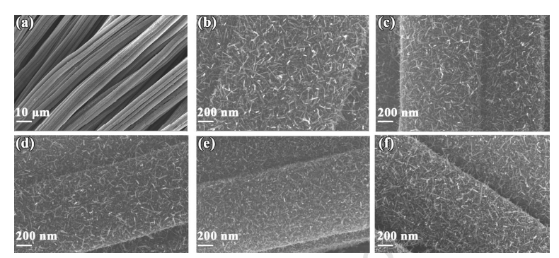 图 2 (a, b) GaN NWs/CC 的 SEM 图像;(c) GaN NWs/CC-150;(d) GaN NWs/CC-300;(e) GaN NWs/CC-400;(f) GaN NWs/CC-500 的 SEM 图像。