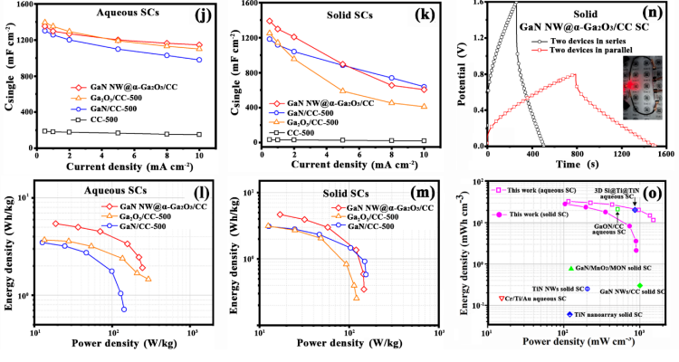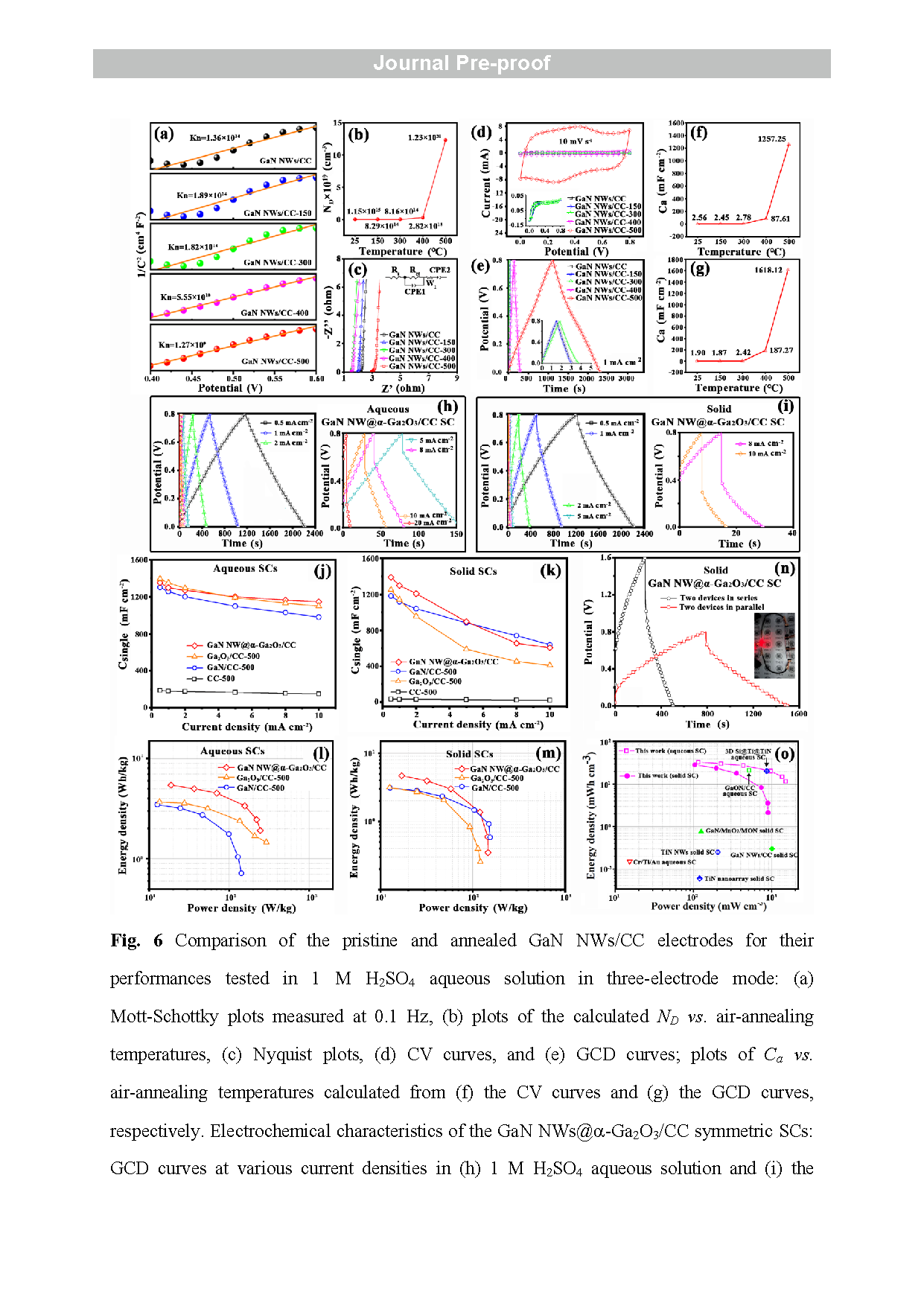 图 6 在三电极体系、1 M H2SO4 水溶液中测试的原始与退火 GaN NWs/CC 电极性能对比:(a) 0.1 Hz 下的 Mott–Schottky 曲线;(b) 计算得到的载流子浓度 ND 随空气退火温度变化关系;(c) Nyquist 图;(d) CV 曲线;(e) GCD 曲线;(f) 由 CV 曲线计算得到的面电容 Ca 随退火温度变化;(g) 由 GCD 曲线计算得到的面电容 Ca 随退火温度变化。GaN NWs@α-Ga2O3/CC 对称超级电容器的电化学特性:(h) 在 1 M H2SO4 水溶液中不同电流密度下的 GCD 曲线;(i) 在 PVA–H2SO4 电解质中的 GCD 曲线;(j) 在 1 M H2SO4 水溶液中的倍率性能;(k) 在 PVA–H2SO4 电解质中的倍率性能;(l) 在 1 M H2SO4 水溶液中的 Ragone 图,并与 GaN/CC-500 与 Ga2O3-CC-500 对称超级电容器对比;(m) 在 PVA–H2SO4 电解质中的 Ragone 图;(n) 两个固态 GaN NWs@α-Ga₂O₃/CC 器件串联与并联的 GCD 曲线,插图为两个串联器件点亮红色 LED;(o) 与其他氮化物/氧化物对称超级电容器的 Ragone 图对比。
