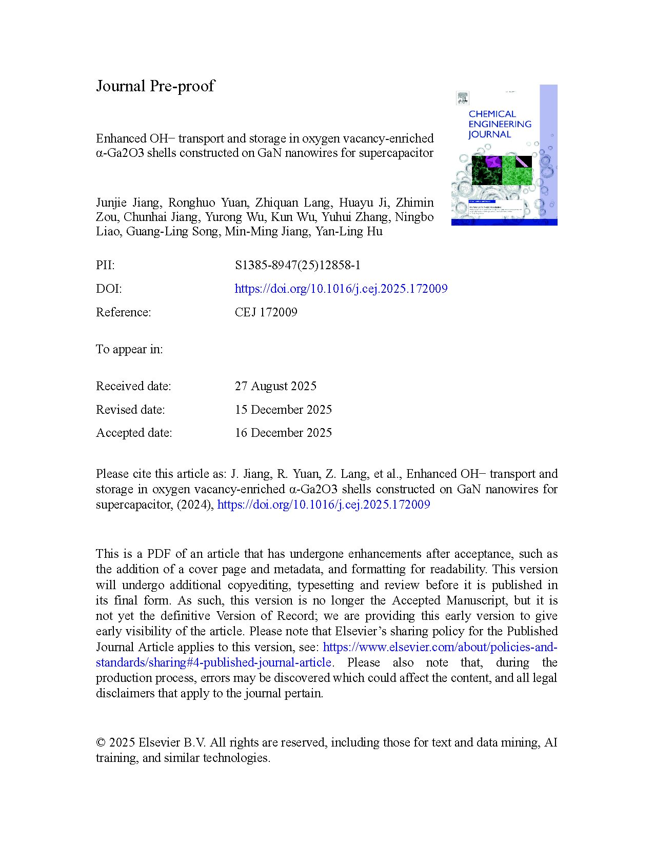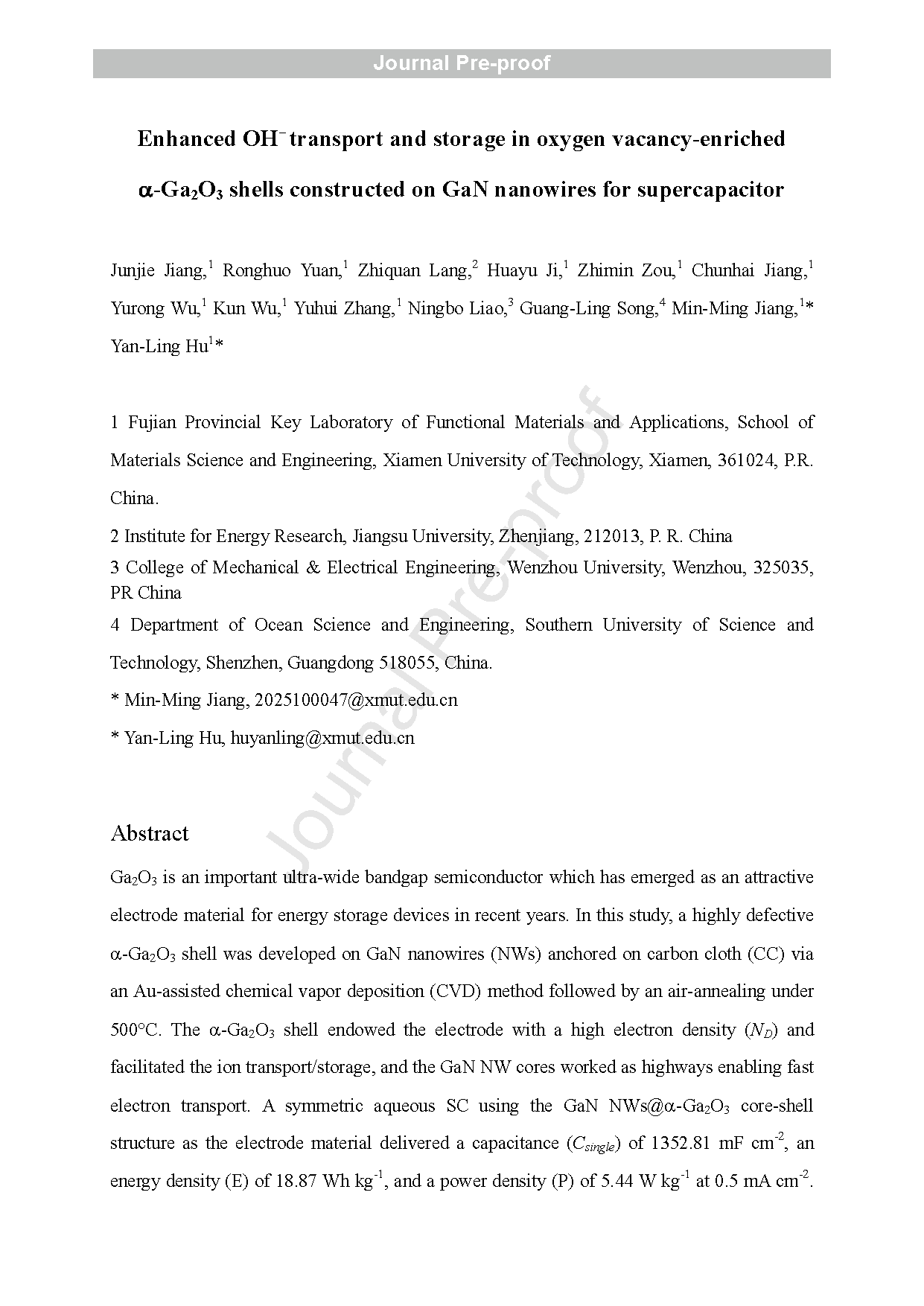 由厦门理工学院的研究团队在学术期刊 Chemical Engineering Journal 发布了一篇名为 Enhanced OH− transport and storage in oxygen vacancy-enriched α-Ga2O3 shells constructed on GaN nanowires for supercapacitor(在氮化镓纳米线表面构建富氧空位 α-Ga2O3壳层以增强 OH⁻ 传输与储存,用于超级电容器)的文章。