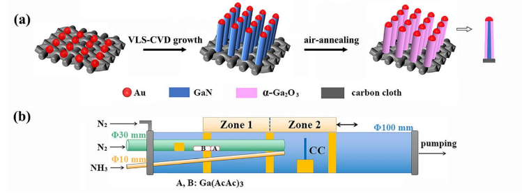 图 1 (a) GaN NWs@α-Ga2O3/CC 电极的合成流程示意图;(b) CVD 生长装置示意图。