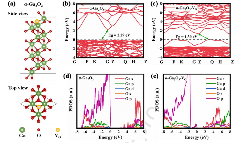 图 8 (a) 体相 α-Ga2O3 晶体的优化结构及氧空位(VO)位置示意;(b, c) α-Ga2O3 与 α-Ga2O3–VO 的能带结构图;(d, e) 对应的投影态密度(PDOS)图。