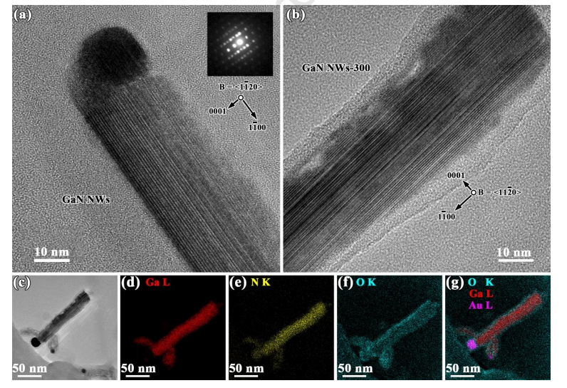 图 3 (a) GaN NWs/CC 中单根纳米线的 HRTEM 图像及其对应的 CBED 图样(插图);(b–c) GaN NWs/CC-300 中单根纳米线的 HRTEM 图像;(d–g) 对应的 EDS/STEM 元素分布(净强度)图,分别为 Ga、N、O 以及 O/Ga/Au。