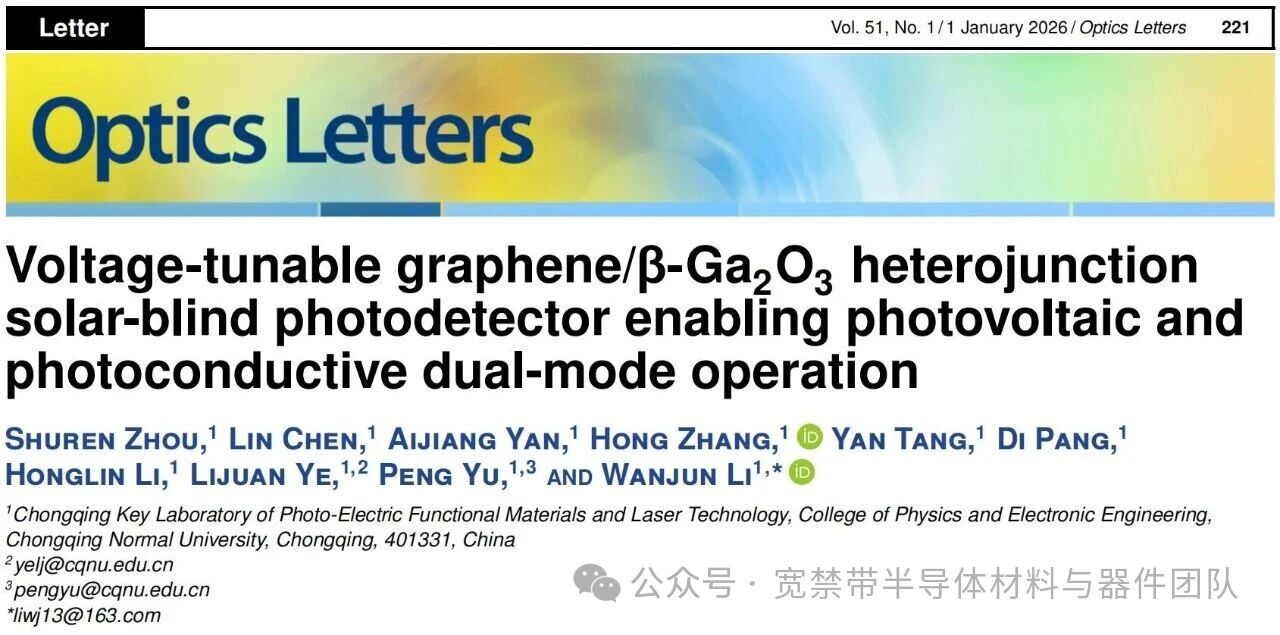 Shuren Zhou, Lin Chen, Aijiang Yan, Hong Zhang, Yan Tang, Di Pang, Honglin Li, Lijuan Ye*, Peng Yu*, Wanjun Li*. Voltage-Tunable Graphene/β-Ga2O3 Heterojunction Solar-Blind Photodetector Enabling Photovoltaic and Photoconductive Dual-Mode Operation. Optics Letters, 2026, 51, 221.