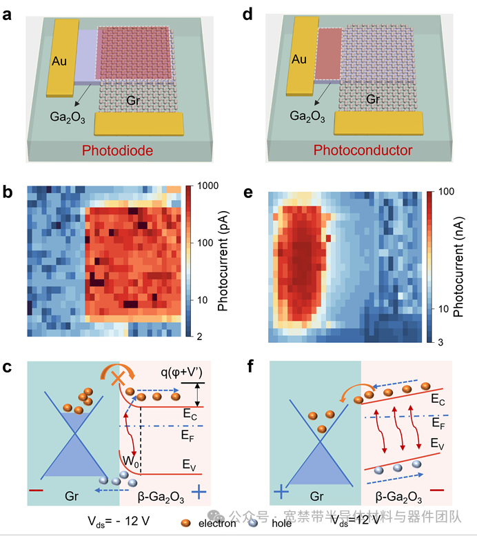 基于氧化镓的深紫外光电探测器兼具卓越的灵敏度与极低的背景噪声,在军用与民用领域均具有极高的应用价值。然而,传统氧化镓光电导型器件虽具备高内部增益特性,却存在响应速度迟缓的缺陷;与之相反,氧化镓基光伏型光电二极管响应速度较快,但受界面势垒限制,其响应度表现欠佳。此外,传统三维异质结因晶格失配问题,往往面临界面质量较差的困境。针对上述问题,本文提出一种电压可调谐石墨烯/β-Ga2O3范德华异质结光电探测器,该器件可实现光伏与光电导双模工作模式。这种偏置可选的双模工作机制,能够使器件兼具高响应度与快速响应特性,在新一代安全光通信及成像系统中展现出良好的应用潜力。