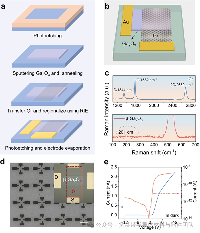 Fig. 1. Gr/β-Ga2O3 heterojunction photodetector: fabrication and electrical characterization. (a) Fabrication process. (b) 3D architecture schematic. (c) Raman spectra of Gr and β-Ga2O3. (d) 4×4 device array optical microscopy image (scale bar, 400 μm). (e) Dark I–V curve.