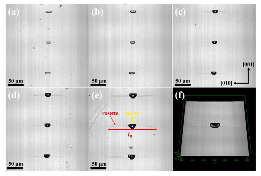 图3. 不同峰值载荷下压痕诱导的位错玫瑰花结的共聚焦激光扫描显微镜图像:(a) 5 mN,(b) 10 mN,(c) 30 mN,(d) 50 mN,(e) 100 mN。图 (f) 为图 (e) 中典型玫瑰花结的三维图像。