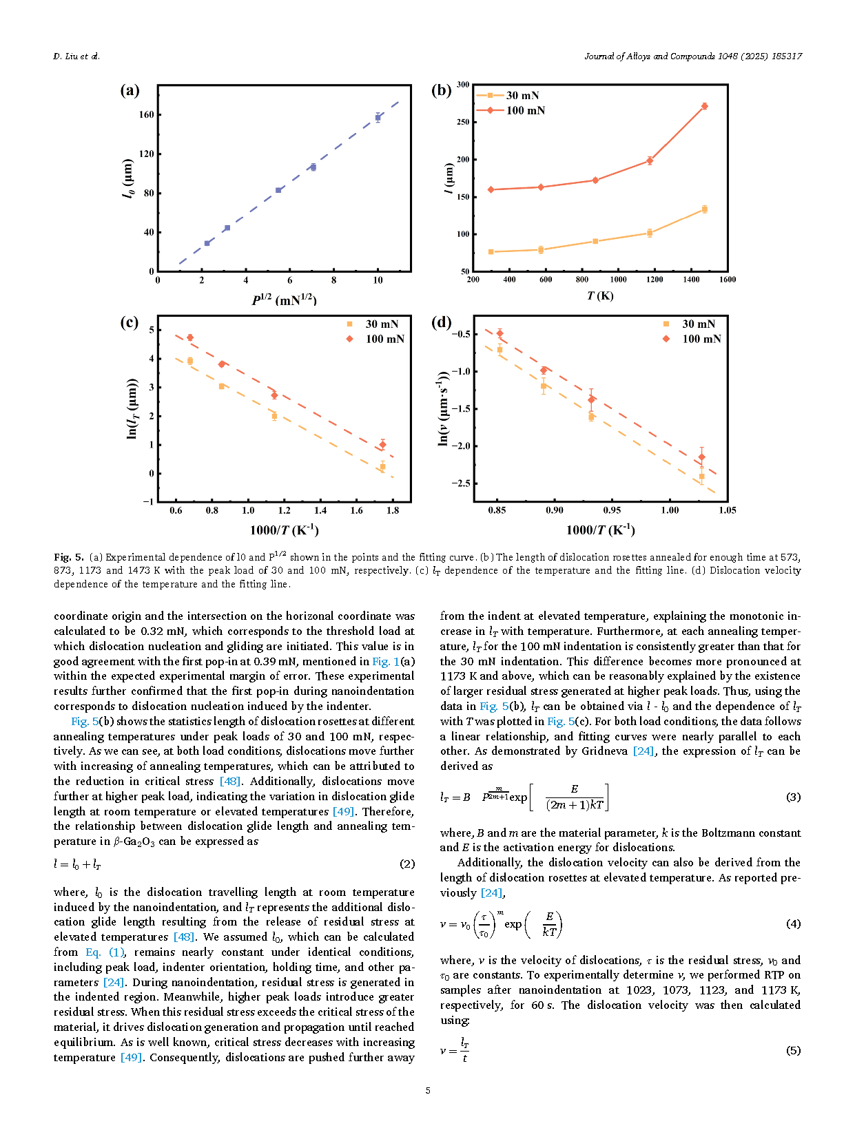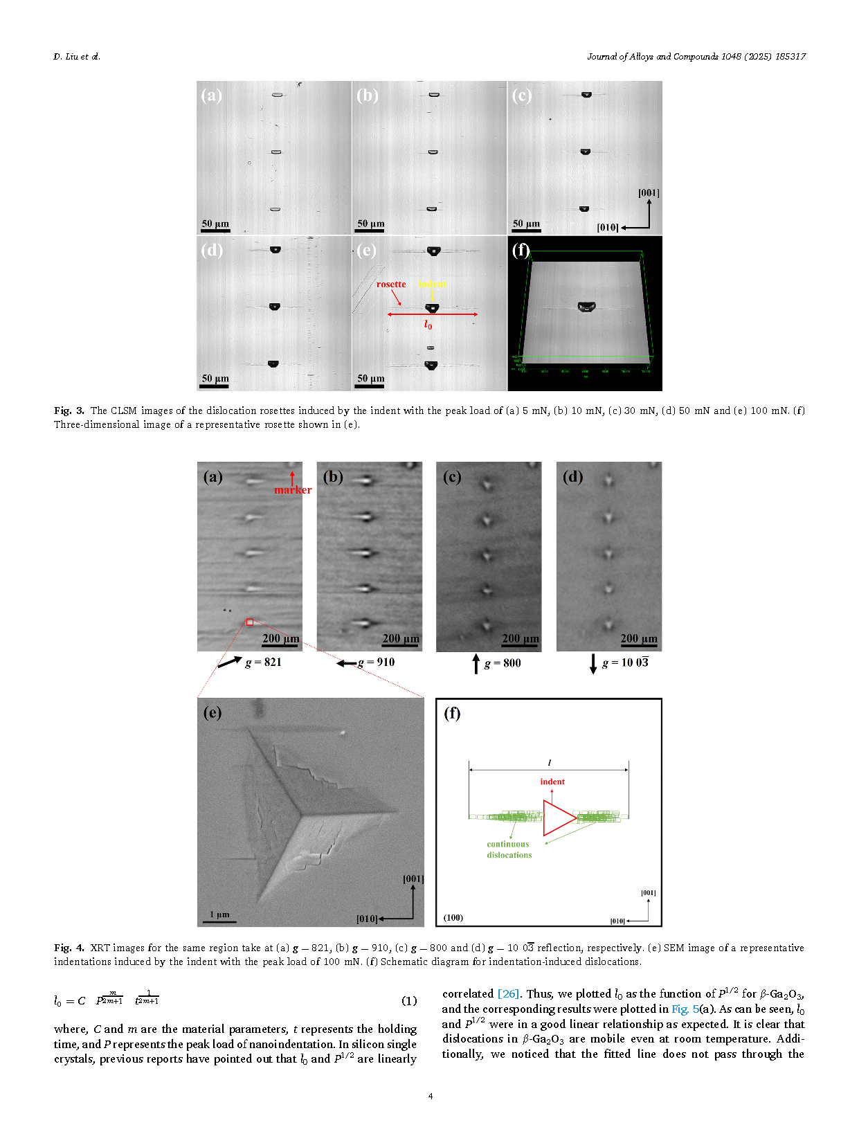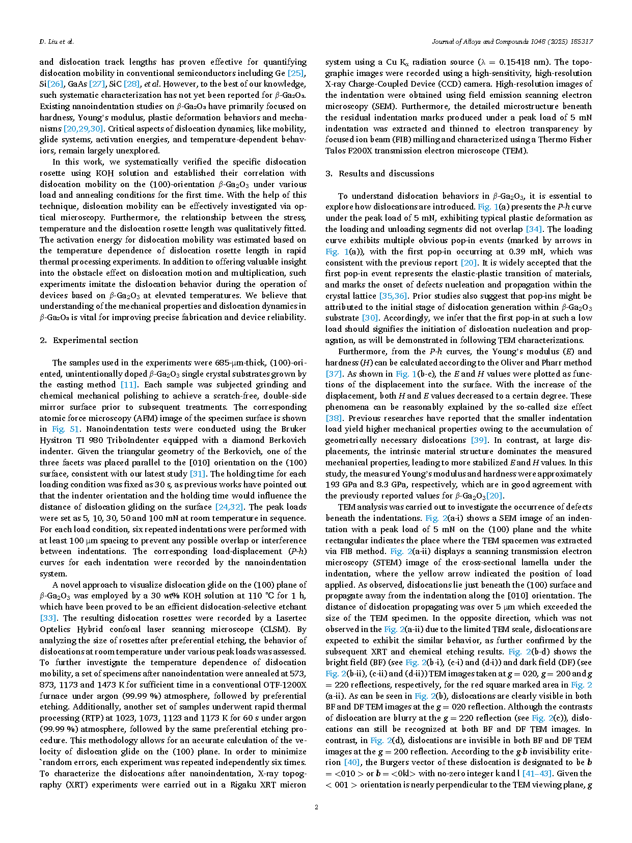 ● β-Ga2O3 位错动力学的全面理解: 本文研究了室温及高温下 (100) 取向样品中的位错迁移率,为位错动力学提供了实验依据,并给出了可靠的位错滑移预测公式。