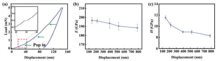 图1. (a) 峰值载荷为 5 mN 的 P-h 曲线,(b) 随位移变化的杨氏模量(E),以及 (c) 随位移变化的硬度(H)。