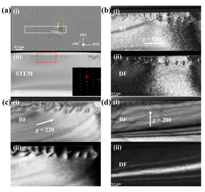 图 2. (a-i)在(100)晶面上施加 5 mN 峰值载荷的压痕的扫描电子显微镜(SEM)图像,白色矩形表示通过聚焦离子束(FIB)方法提取透射电子显微镜(TEM)薄片的位置。(a-ii)压头下方横截面薄片的扫描透射电子显微镜(STEM)图像。(b-i)在 g = 020 反射下拍摄的明场(BF)和(b-ii)暗场(DF)TEM 图像,(c-i)在 g = 220 反射下拍摄的明场(BF)和(c-ii)暗场(DF)TEM 图像,以及(d-i)在 g = 200 反射下拍摄的明场(BF)和(d-ii)暗场(DF)TEM 图像,这些图像对应于(a-ii)中红色方框标记的区域。