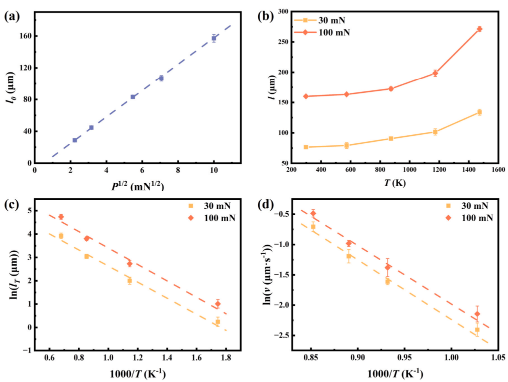 图5. (a) 实验测得的 l0 与 P1/2 随温度变化关系(数据点)及拟合曲线。(b) 在 573、873、1173 和 1473 K 下充分退火处理的位错玫瑰花结长度,峰值载荷分别为 30 和 100 mN。(c) lT 随温度变化关系及拟合曲线。(d) 位错速度随温度变化关系及拟合曲线。