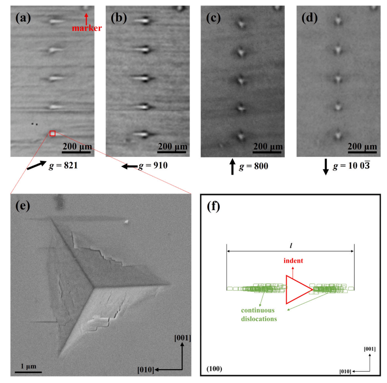 图4. 同一区域在 (a) g = 821、(b) g = 910、(c) g = 800及 (d) g = 10 0-3 反射面处拍摄的 XRT 图像。(e) 峰值载荷为 100 mN 的压痕所致典型凹陷的 SEM 图像。(f) 压痕诱导位错示意图。