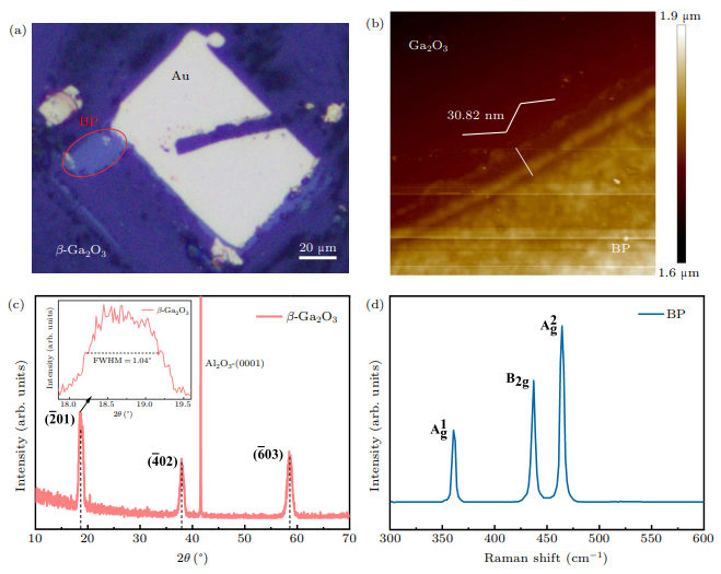 图1. (a) 基于 β-Ga2O3/BP pn 异质结制备的紫外/红外光探测器光学显微镜图像。(b) 原子力显微镜图像(扫描范围:15.3 µm × 15.3 µm)。(c) β-Ga2O3 薄膜的 X 射线衍射图谱;插图显示 (-201) 衍射峰,其半高宽为 1.04°。(d) BP 薄片的拉曼光谱。