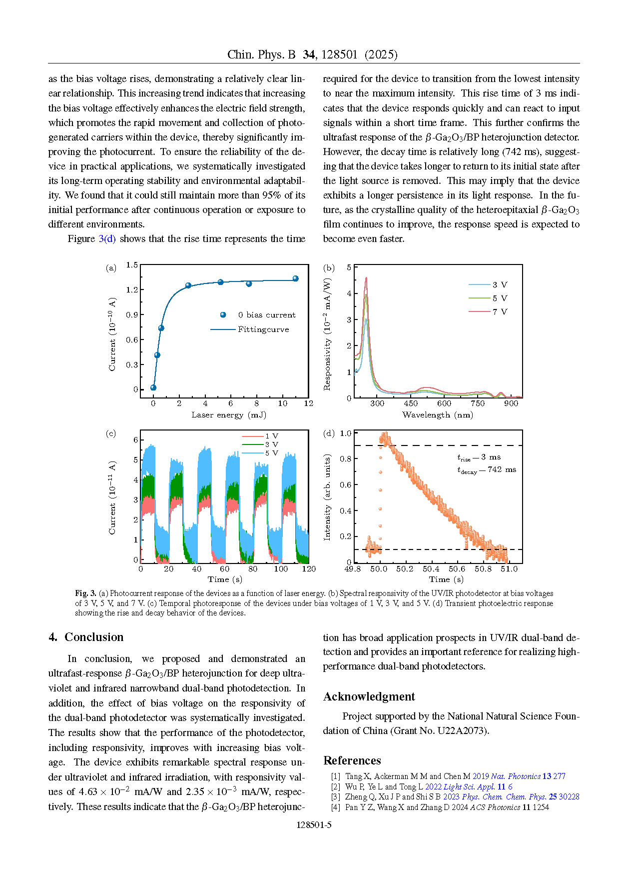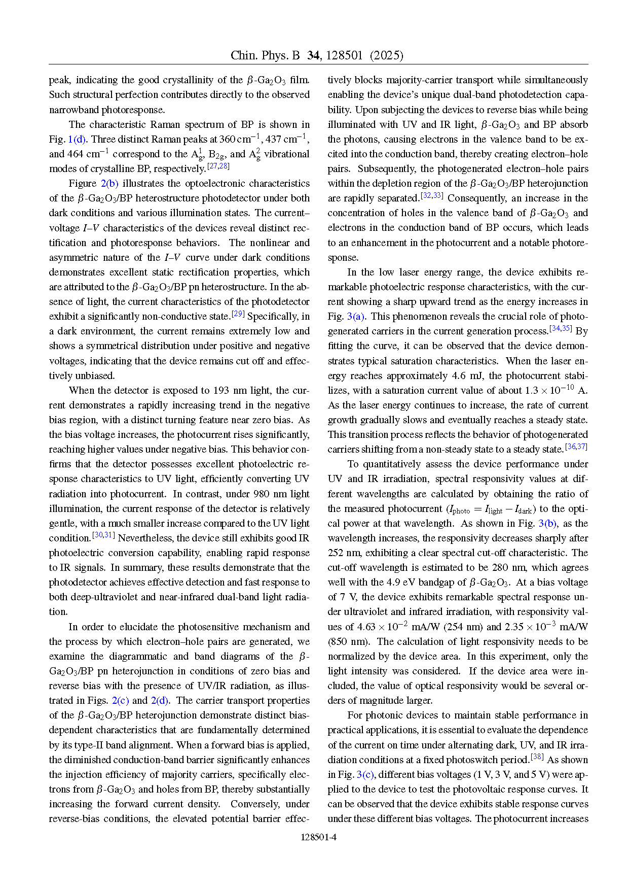 研究团队提出并演示了用于深紫外和红外窄带双波段光探测的超快响应 β-Ga2O3/BP 异质结。此外,系统研究了偏压电压对双波段光探测器灵敏度的影响。结果表明,光探测器的性能(包括灵敏度)随偏压电压的增加而提升。该器件在紫外与红外辐射下展现出卓越的光谱响应特性,响应度值分别为 4.63×10−2 mA/W 和 2.35×10−3 mA/W。这些成果表明 β-Ga2O3/BP 异质结在 UV/IR 双波段检测领域具有广阔的应用前景,为实现高性能双波段光探测器提供了重要参考。