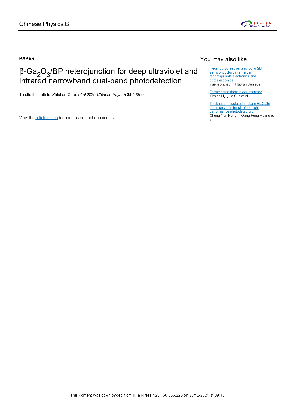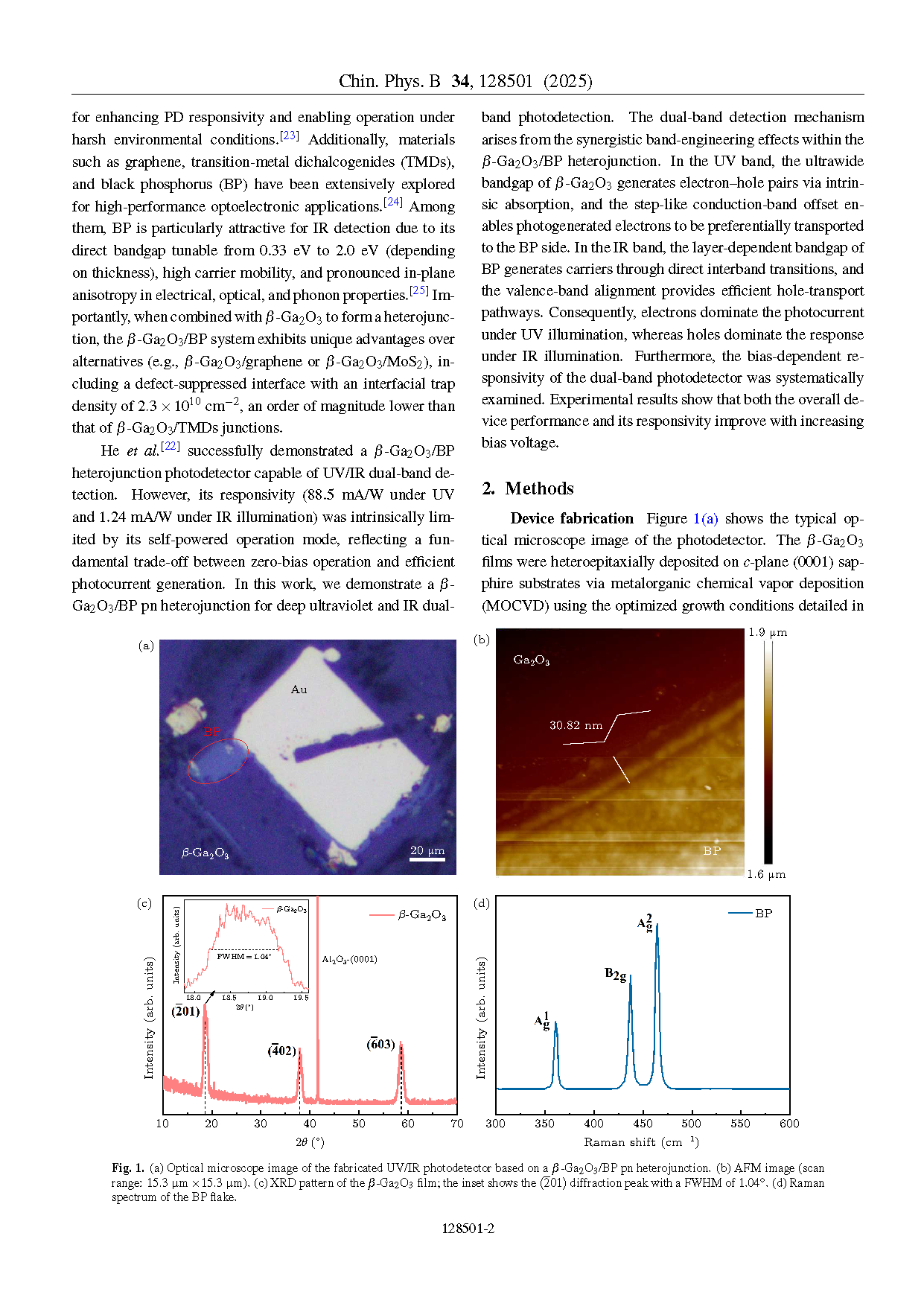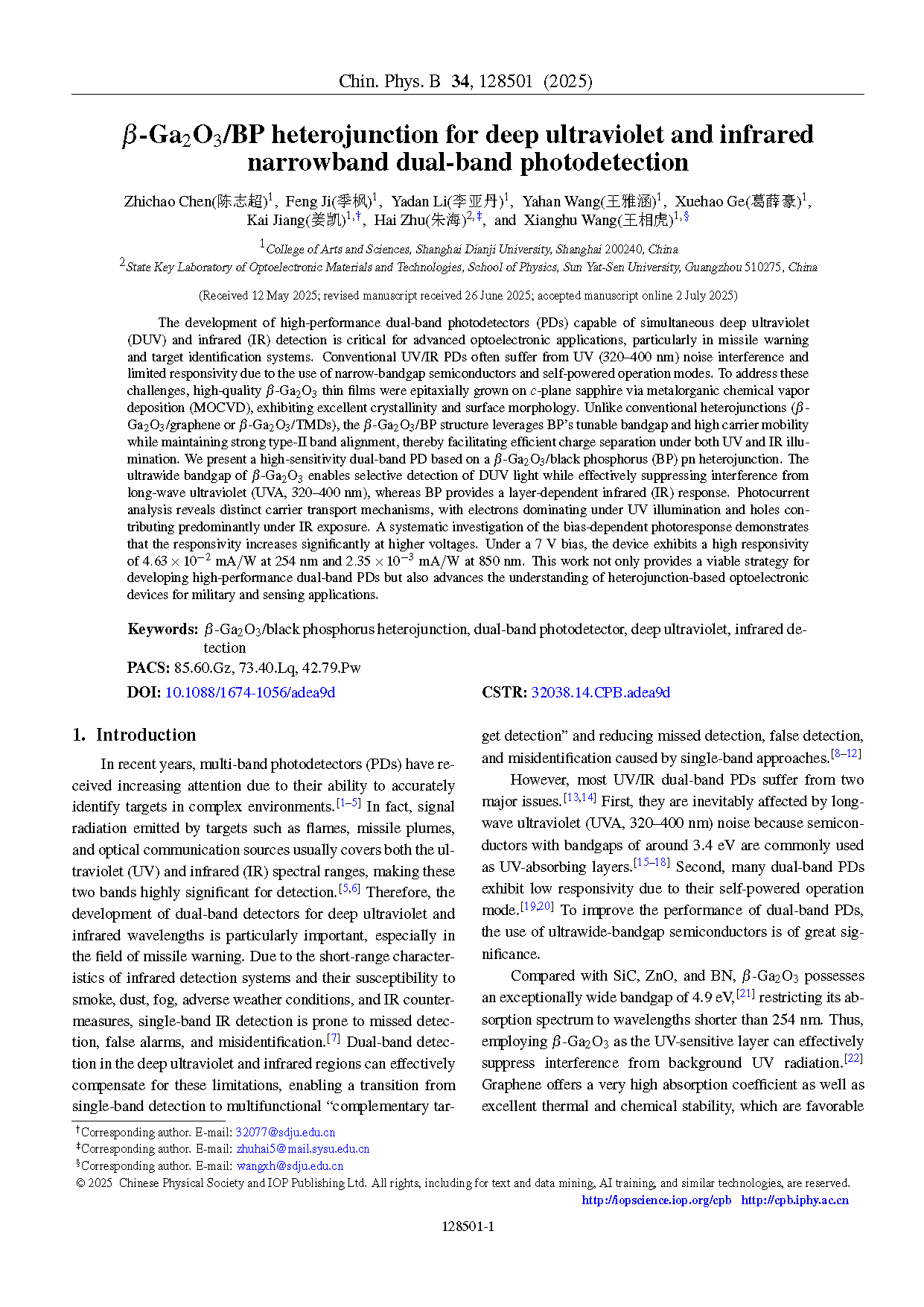 由上海电机学院的研究团队在学术期刊 Chinese Physics B 发布了一篇名为 β-Ga2O3/BP heterojunction for deep ultraviolet and infrared narrowband dual-band photodetection(β-Ga2O3/BP异质结用于深紫外和红外窄带双频带光检测)的文章。