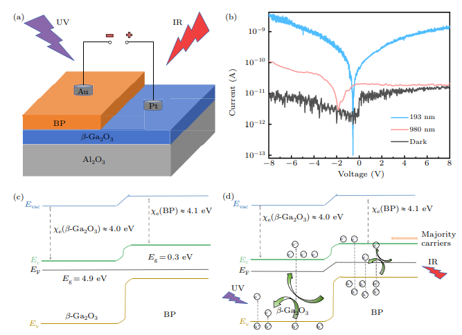 在复杂的现代战争和环境监测中,单一波段的探测器容易受到干扰,导致漏检或误报。结合深紫外(DUV)和红外(IR)的双波段探测器可以显著提高目标识别的准确性。传统的紫外探测器常用带隙约 3.4 eV 的材料,这使得对 320-400 nm 的 UVA 也异常灵敏,导致在日盲探测应用中信噪比降低,进而必须依赖滤光片。目前报道的许多异质结双波段探测器采用自供电模式,虽然无需外接电源,但光生载流子的分离效率低,导致探测器的响应度通常很低,限制了实际应用。β-Ga2O3 具有超宽带隙,天然具有日盲特性,可完美屏蔽 UVA 和可见光干扰。黑磷(BP)作为优秀的二维材料,具有层数依赖的可调带隙和极高的载流子迁移率,是优异的红外探测材料。相比于 β-Ga2O3 与其他二维材料的结合,β-Ga2O3/BP 界面缺陷密度更低,且能形成有利于电荷分离的 II 型能带排列。