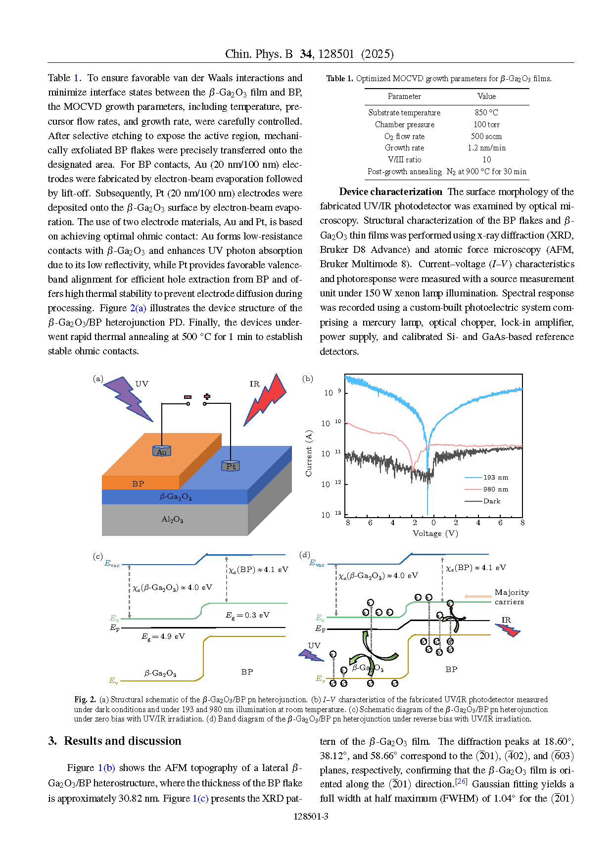 ● 不同于许多使用机械剥离或低质量薄膜的研究,本文基于 MOCVD 生长的高质量 β-Ga2O3 外延层构建异质结,奠定了高性能器件的材料基础。