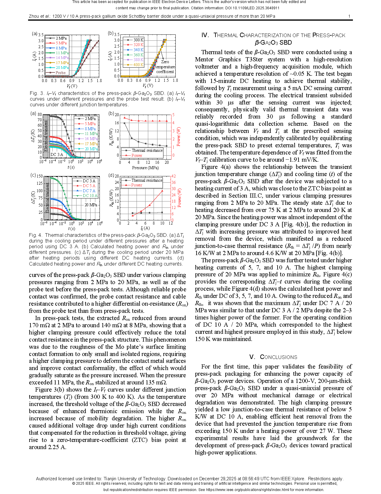 本文首次验证了压装封装技术提升 β-Ga2O3 功率器件功率容量的可行性。实验证明,在超过 20 MPa 的准单轴压力下,厚度为 200 μm 的 1200 V 压装封装 β-Ga2O3 反向偏置二极管(SBD)能够稳定工作,且未出现机械损伤或电气性能退化。高压封装工艺使器件在直流 10 A 条件下实现低于 5 K/W 的结-壳热阻,有效清除器件热量,在超过 27 W 的加热功率下仍能将结温升控制在 150 K 以内。这些实验成果为压封 β-Ga2O3 器件向实际高功率应用方向发展奠定了基础。