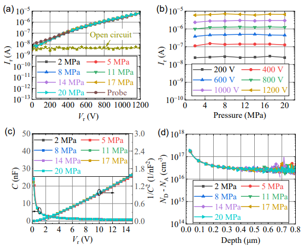 •实验证明,在 2 MPa 到 20 MPa 的压力范围内,器件的反向漏电流保持稳定,且肖特基势垒高度未受影响,表明高压未造成机械损伤或引入电学缺陷。