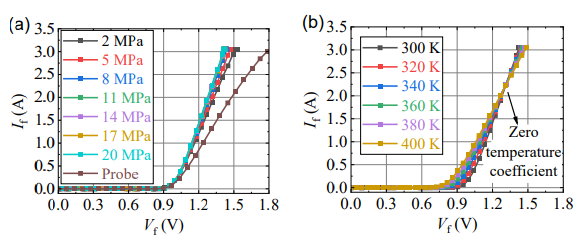 图3. 压制封装 β-Ga2O3 反向偏压二极管的 If–Vf 特性曲线。(a) 不同压力下的 If–Vf 曲线及探针测试结果。(b) 不同结温下的 If–Vf 曲线。