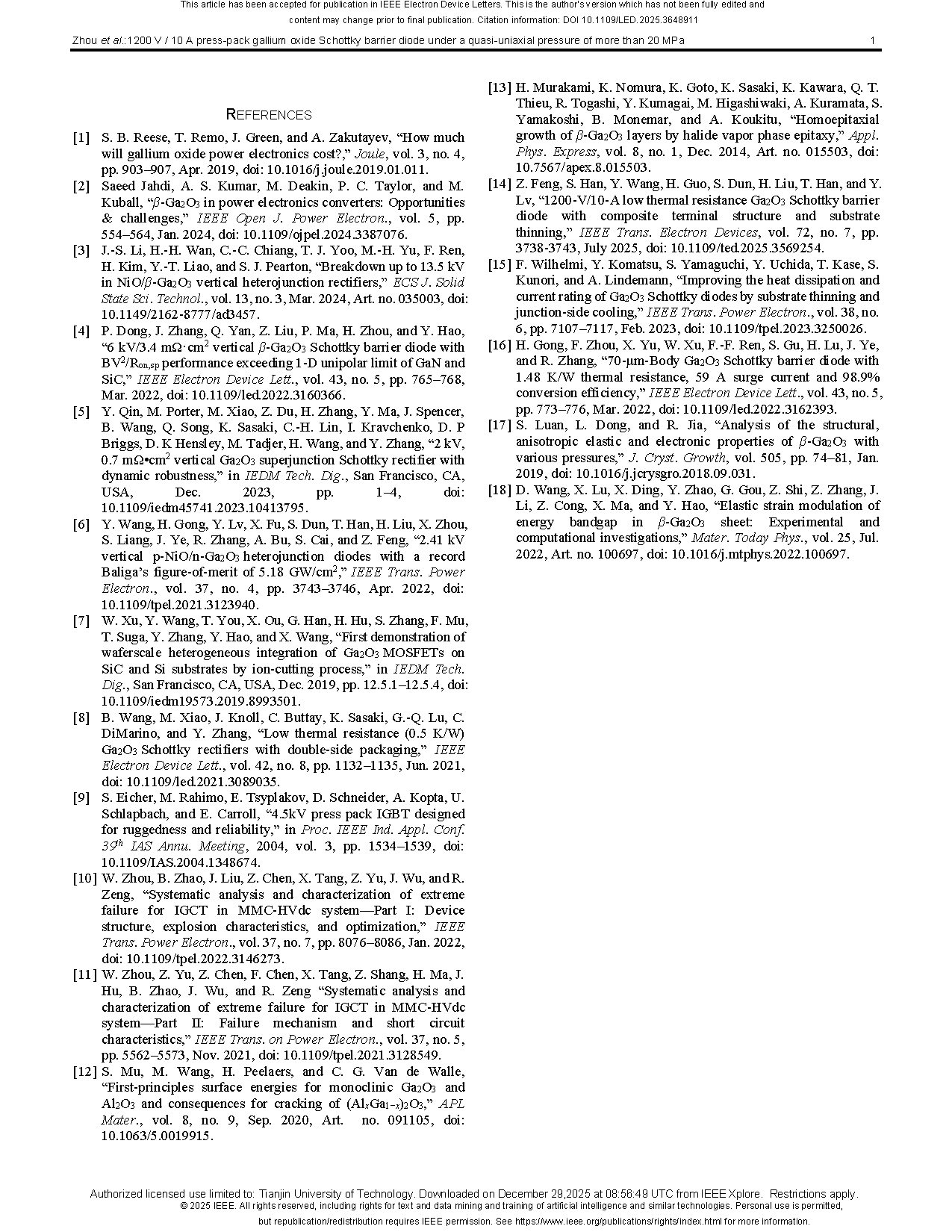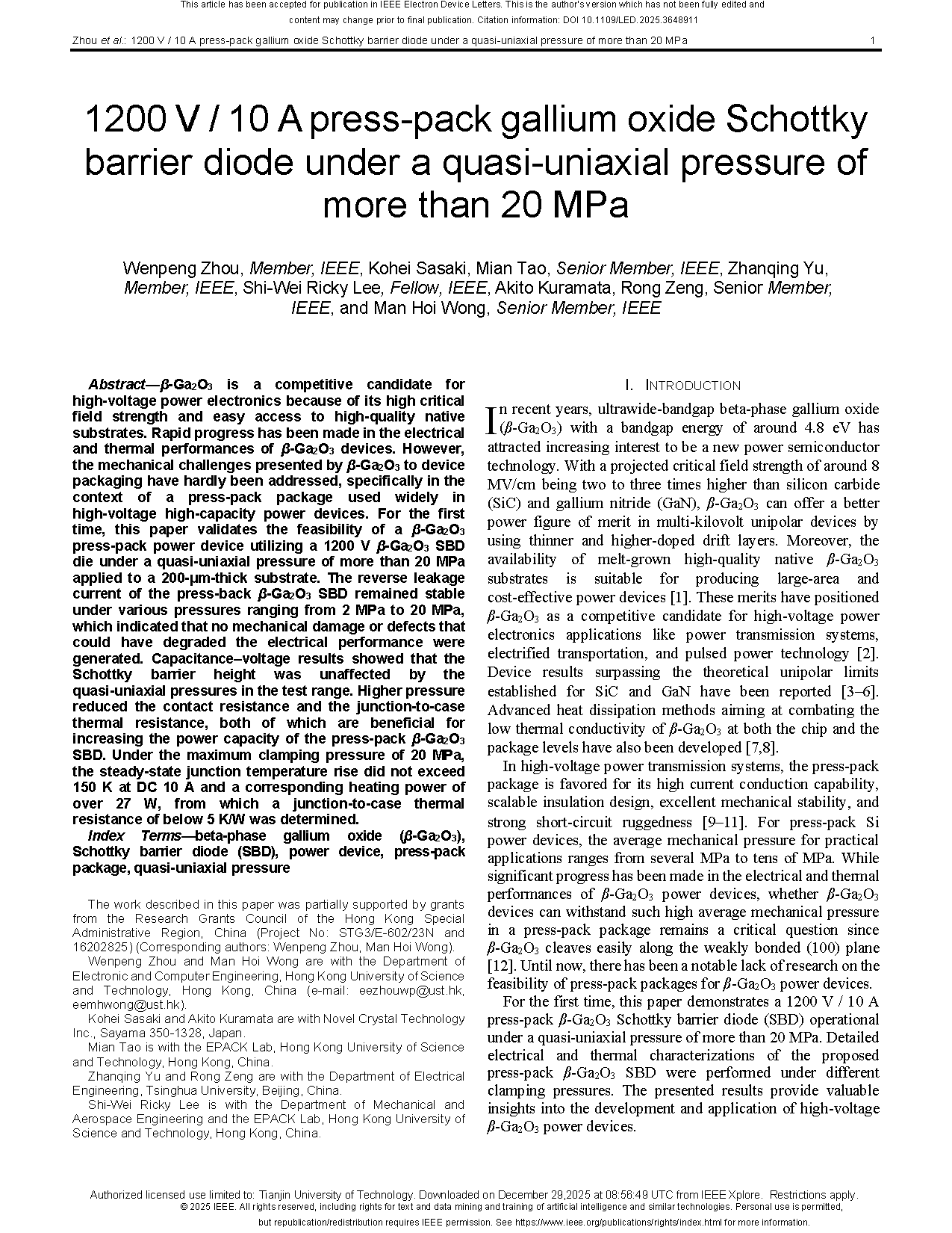 由日本NCT仓又朗人、佐佐木公平技术团队联合香港科技大学黄文海教授研究团队在学术期刊 IEEE Electron Device Letters 发布了一篇名为1200 V / 10 A press-pack gallium oxide Schottky barrier diode under a quasi-uniaxial pressure of more than 20 MPa(在超过20MPa准单轴压力下的1200V/10A压接式氧化镓肖特基势垒二极管)的文章。