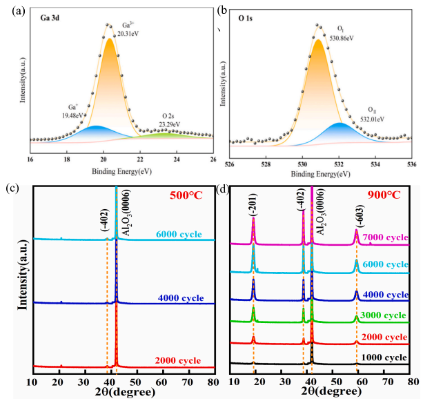图1. 蓝宝石衬底上生长 Ga2O3 薄膜的 XPS 光谱:(a) Ga 3d 能级;(b) O 1s 能级。Ga2O3 薄膜的 XRD 衍射图谱:(a) 500℃ 退火处理;(b) 900℃ 退火处理。
