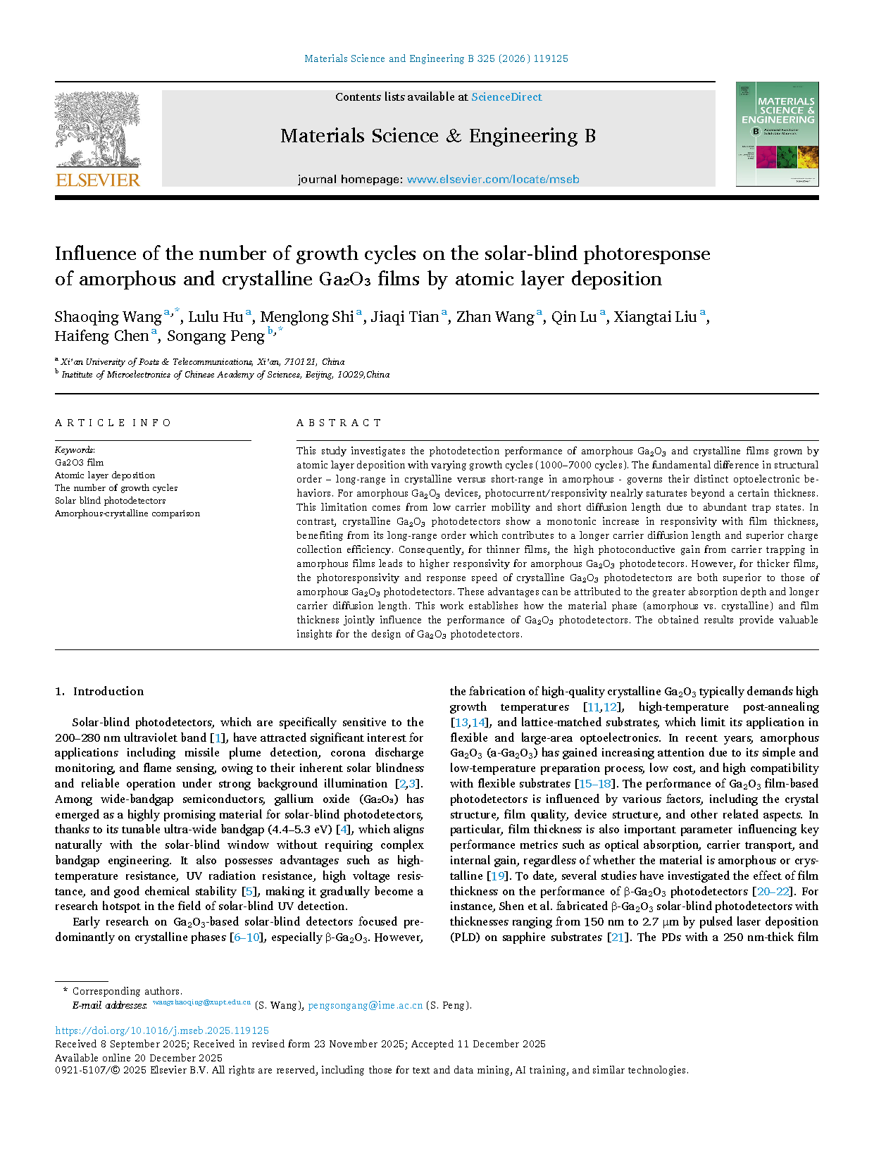 由西安邮电大学的研究团队在学术期刊 Materials Science and Engineering: B 发布了一篇名为 Influence of the number of growth cycles on the solar-blind photoresponse of amorphous and crystalline Ga2O3 films by atomic layer deposition(原子层沉积法制备的非晶和晶体 Ga2O3 薄膜中生长周期数对日盲光响应的影响)的文章。