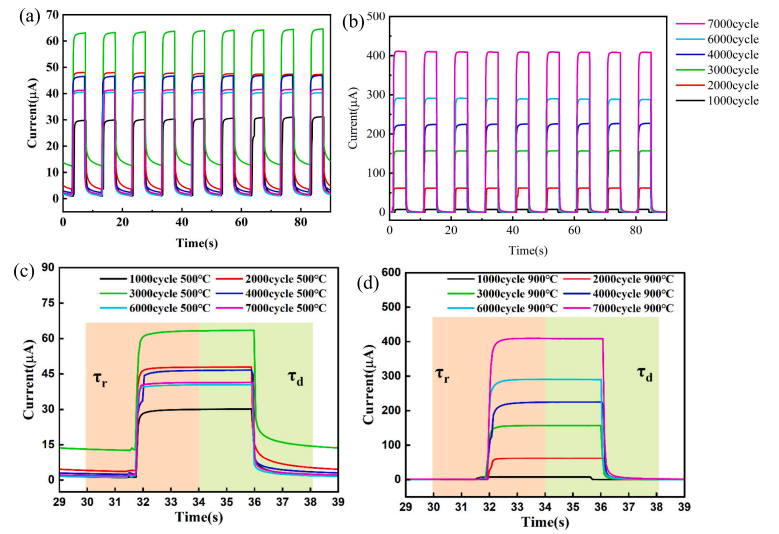 图5. 在 (a) 500℃ 和 (b) 900℃ 退火处理后样品的多周期时间依赖性光响应特性;在 10V 偏压下,(c) 500℃ 和 (d) 900℃ 退火处理后不同周期光响应曲线的部分放大图。