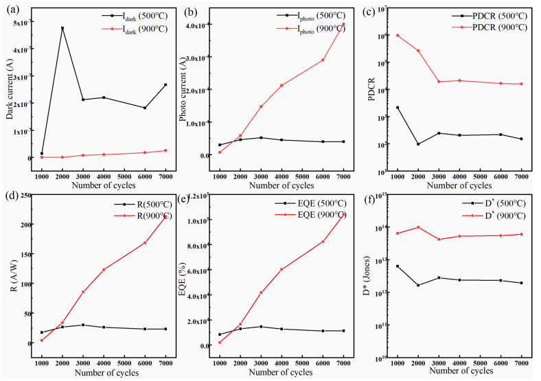 图4. 非晶态(500 ℃)与晶态(900 ℃)Ga2O3光探测器不同参数随 ALD 循环次数变化的对比。(a)暗电流(b)光电流(c)PDCR(d)响应度(e)外部量子效率(f)比探测率。