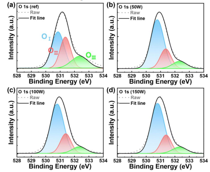 图5. 等离子体处理 β-Ga2O3 衬底的 O 1s 峰 XPS 光谱,偏压功率分别为:(a) 未处理样品,(b) 50 W,(c) 100 W,(d) 150 W。