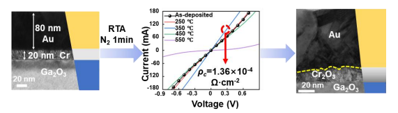 图3. 热退火处理前后界面形态。β-Ga2O3 样品上 Cr/Au 接触的 TLM 结构在 250 ℃ 至 550 ℃ 退火温度下的 I-V 特性曲线。