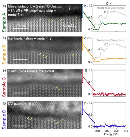 图6. (a)、(c)、(e) 和 (g) 沿 [001] 区轴方向的 Ti/Ga2O3 界面原子分辨率 ADF-STEM 图像,(b)、(d)、(f) 和 (g) (h) 分别在 (a)、(c)、(e) 和 (g) 图中双向箭头所示区域内,跨越 Ti 层与 Ga2O3 层获得的归一化 C–K 能区电子能量损失谱。
