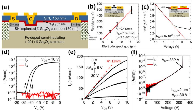 图9. (a) 全掺杂 β-Ga2O3 MOSFET 的示意性横截面,(b) 基于硅掺杂半绝缘 (-201) β-Ga2O3 的 TLM 结构中,总电阻随电极间距变化的拟合曲线图, (c) 100 kHz 频率下 -15 至 5 V 电压扫描的 1/C2-V 曲线,测得载流子浓度为 2.6 × 1018 cm3,(d) 转移特性及 (e) 输出特性曲线,对应制备的 LGD 为 2 μm 的全掺杂 β-Ga2O3 MOSFET。(f) 具有 2 μm 线宽-沟距的全部植入式 β-Ga2O3 MOSFET 三端关态击穿测量,显示在 332 V 时发生灾难性击穿。
