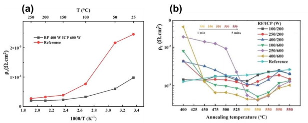 图4. (a) 采用 RF 400 W/ICP 600 W 蚀刻条件,在蚀刻表面进行圆形 TLM 所得的温度依赖性 ρc 值;(b) 不同蚀刻条件与退火温度下的 ρc 值。参考样品为未经蚀刻的对照样品。