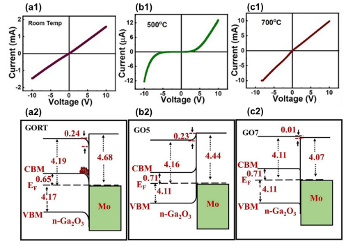 图2. (a1-c1) 在氩气环境中退火 30 分钟后,原始样品与不同退火温度下 Au/Al/Mo/Ga2O3 接触堆叠的 I-V 特性曲线。(a2-c2) 不同退火温度下样品在 Mo/Ga2O3 界面处的能带对齐示意图。