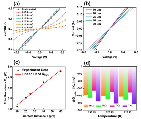 图7. (a) β−Ga2O3 样品上 Ti/Au 接触的 TLM 结构在 0.05 J·cm-2 至 0.3 J·cm-2 退火温度下的 I-V 特性曲线,(b) 间距对 Ti/Au 电极 I-V 特性的影响 Ti/Ga2O3 界面化学反应。