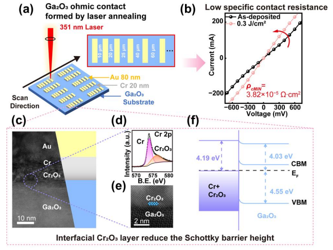 图8. (a) 样品制备、激光退火及 LTLM 图案化示意图,(b) β−Ga2O3 衬底上集成 Cr/Au 接触的 LTLM 结构电学特性,(c) β−Ga2O3/Cr/Au 的透射电子显微镜图像, (d) 经 0.3 J/cm2 退火处理后界面处 Cr 2p 精细能谱拟合,(e) 截面高分辨球差校正透射电子显微镜图像,(f) 经 0.3 J/cm2 激光退火处理后 Cr/Ga2O3 界面能带对齐示意图。