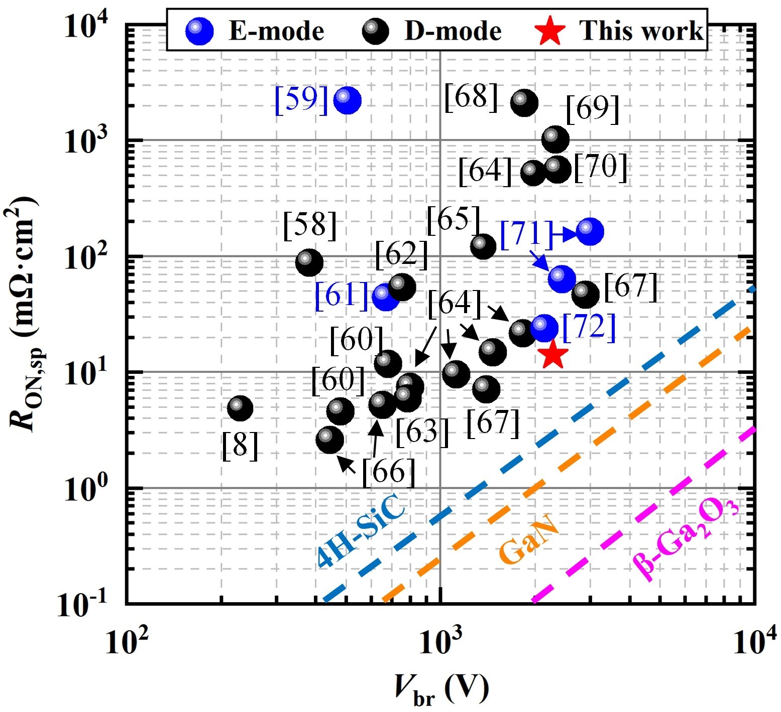 图10. 最优设计参数(45°沟道取向、δ掺杂电荷密度5 × 1013 cm−2、掺杂位置28 nm)下器件性能仿真(300 K、VGS = −50 V),对比文献[8], [58]-[72]中前沿 β-Ga2O3 MOSFET 性能。