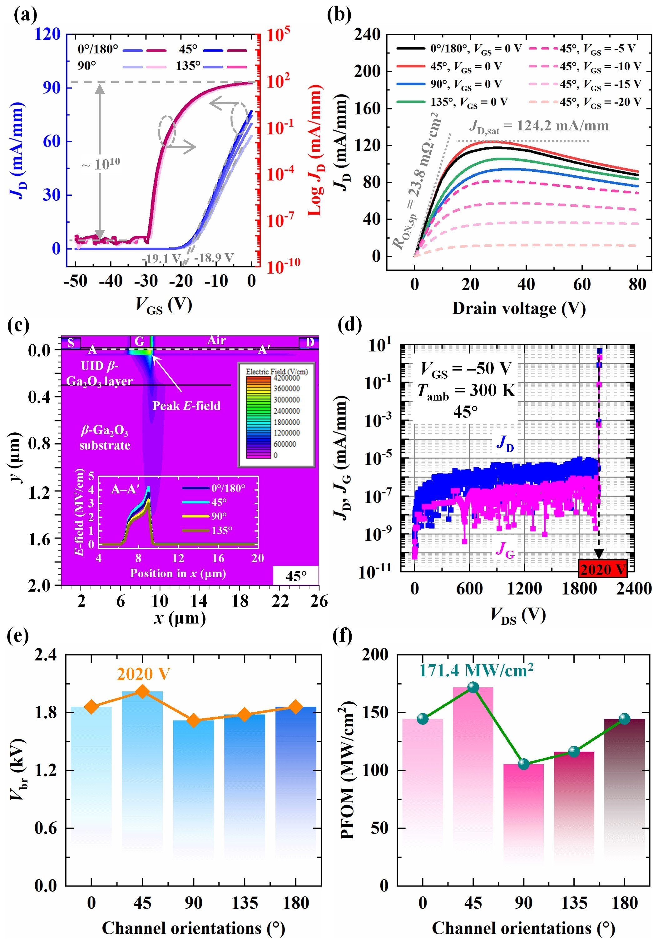 图6. 不同沟道取向下 β-Ga2O3 MOSFET 的仿真结果:(a) VDS = 10 V时的转移曲线,(b) VGS = 0 V时的输出曲线,(c) 沟道表面电场分布,(d) VGS = −50 V时的关态击穿特性,(e) 击穿电压(Vbr),(f) 功率优值(PFOM)。