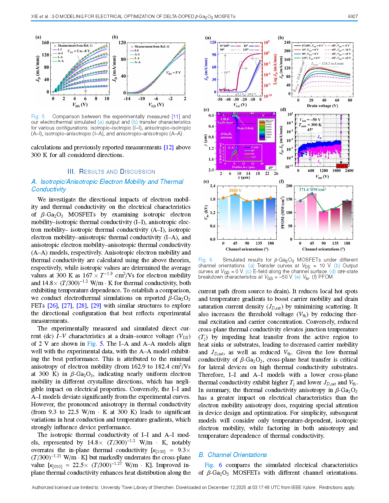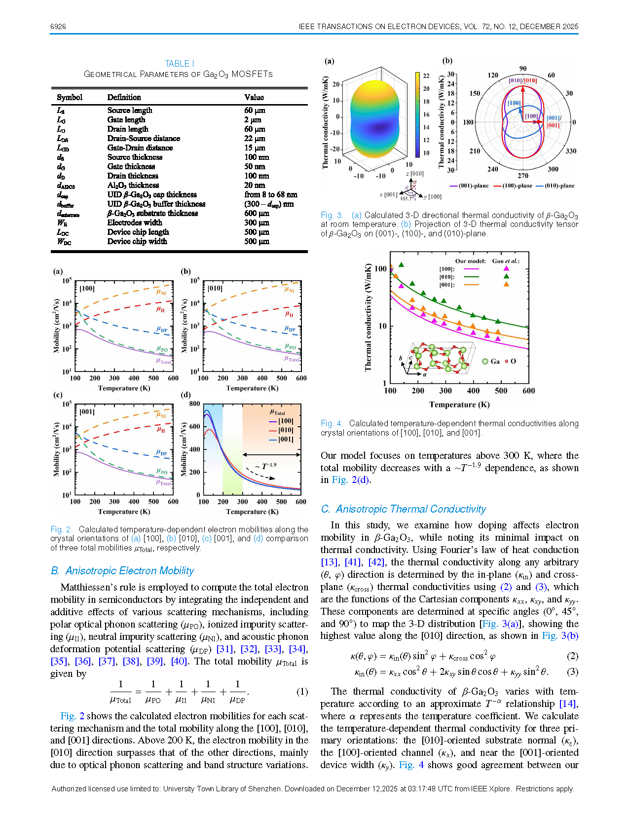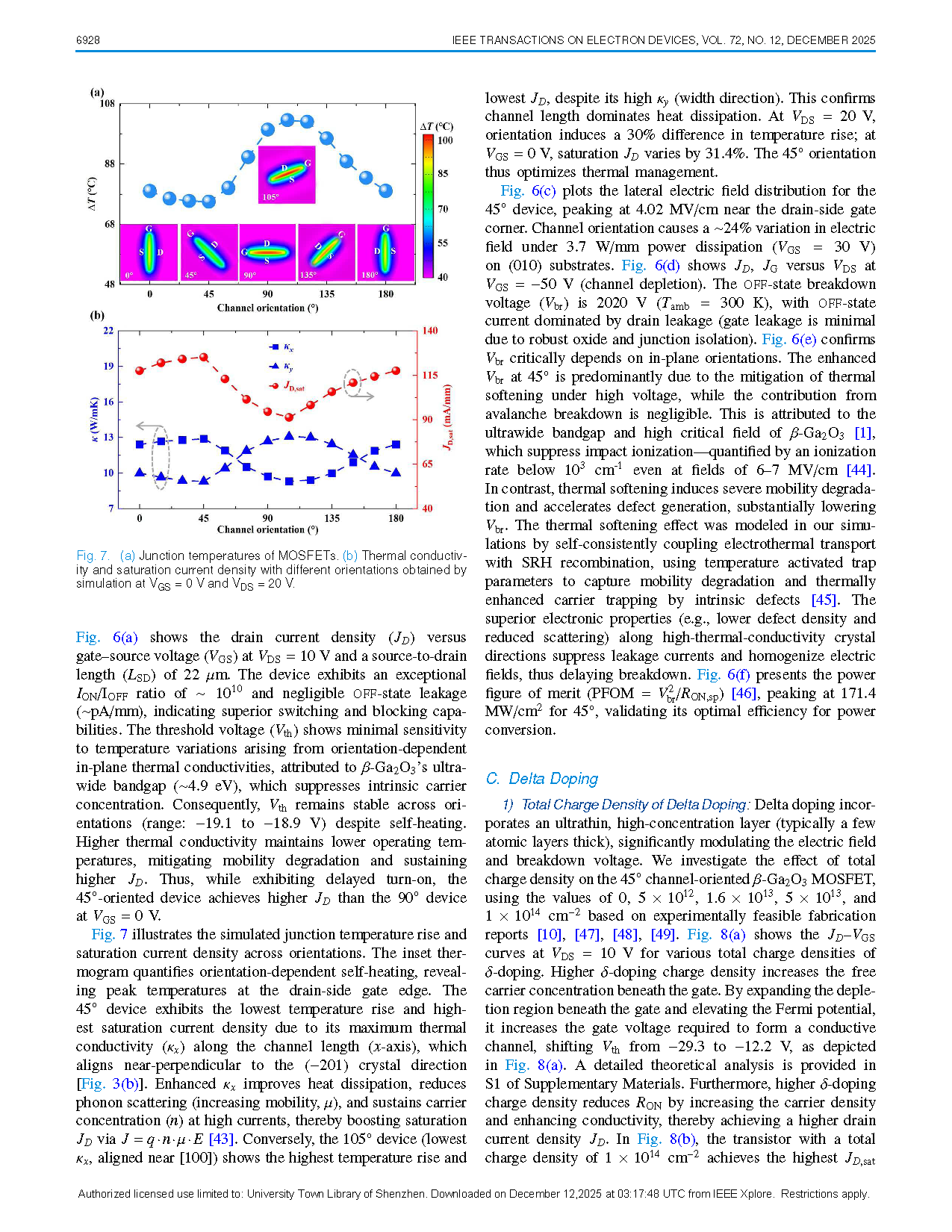 β-Ga2O3 作为一种超宽禁带半导体材料,因其高临界电场(~8 MV/cm)和优异的 Baliga 品质因子,在功率电子器件中展现出巨大潜力。然而,其较低的热导率严重制约了器件在高功率下的可靠性与性能表现。传统研究多关注单一的电学或热学优化,缺乏电-热-结构协同设计的系统方法,尤其是对各向异性迁移率、热导率、沟道取向与δ掺杂工艺的综合影响尚未深入揭示。