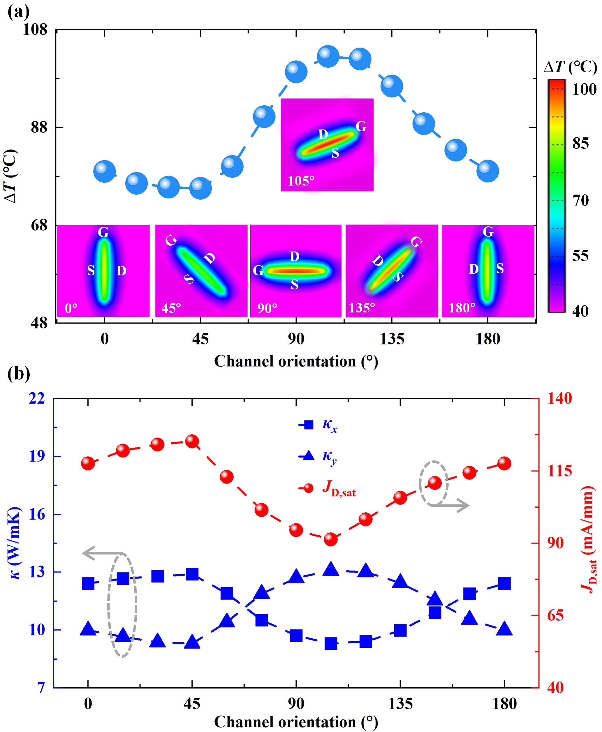 图7. VGS = 0 V、VDS = 20 V条件下仿真得到的:(a) MOSFET 结温分布,(b) 热导率与饱和电流密度随取向的变化。