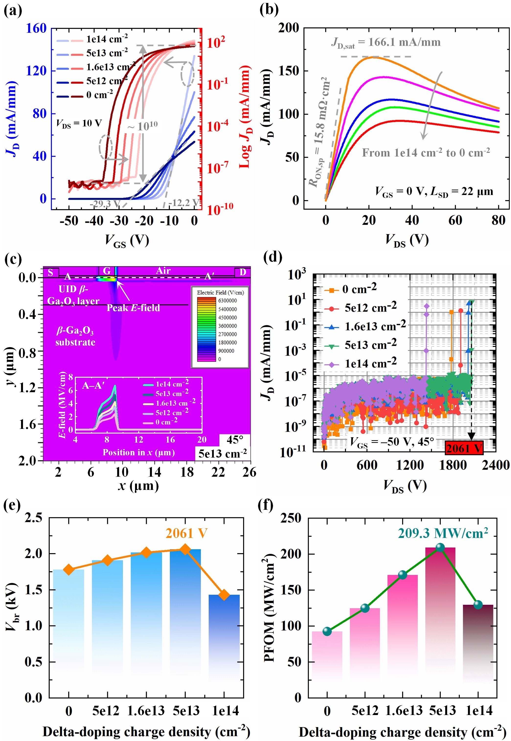 图8. 五种δ掺杂总电荷密度下 β-Ga2O3 MOSFET 的仿真结果:(a) VDS = 10 V时的转移曲线,(b) VGS = 0 V时的输出曲线,(c) 沟道表面电场分布,(d) VGS = −50 V时的关态击穿特性,(e) 击穿电压(Vbr),(f) 功率优值(PFOM)。