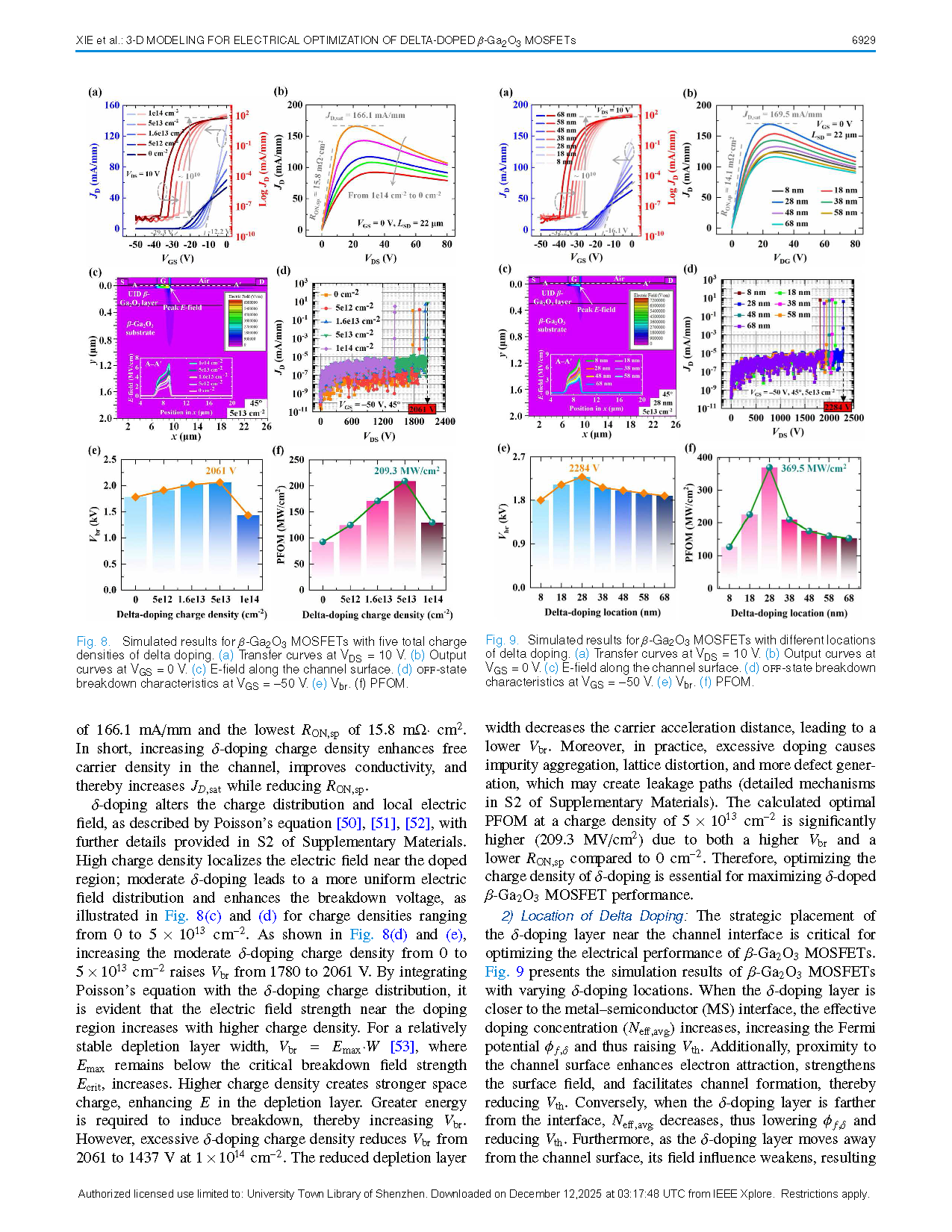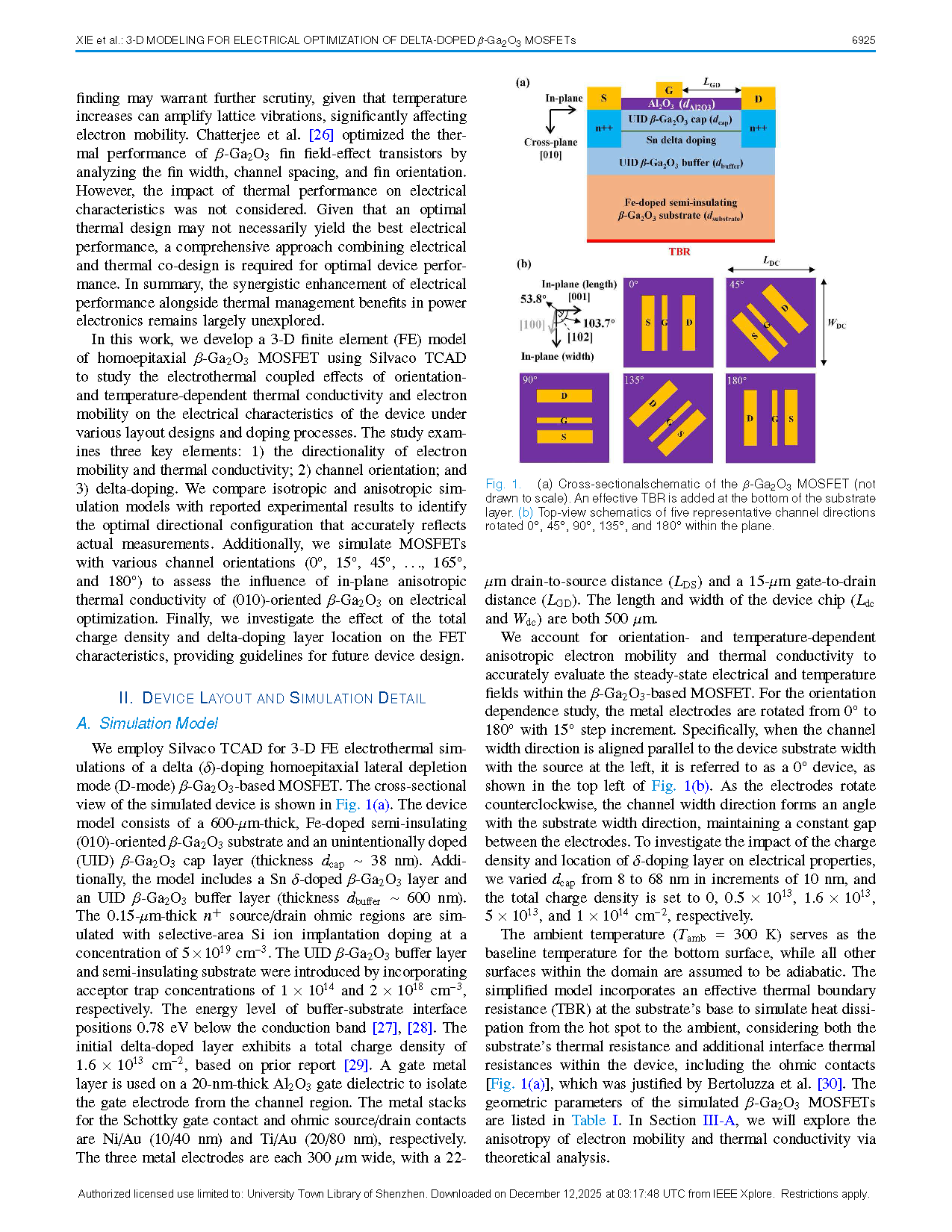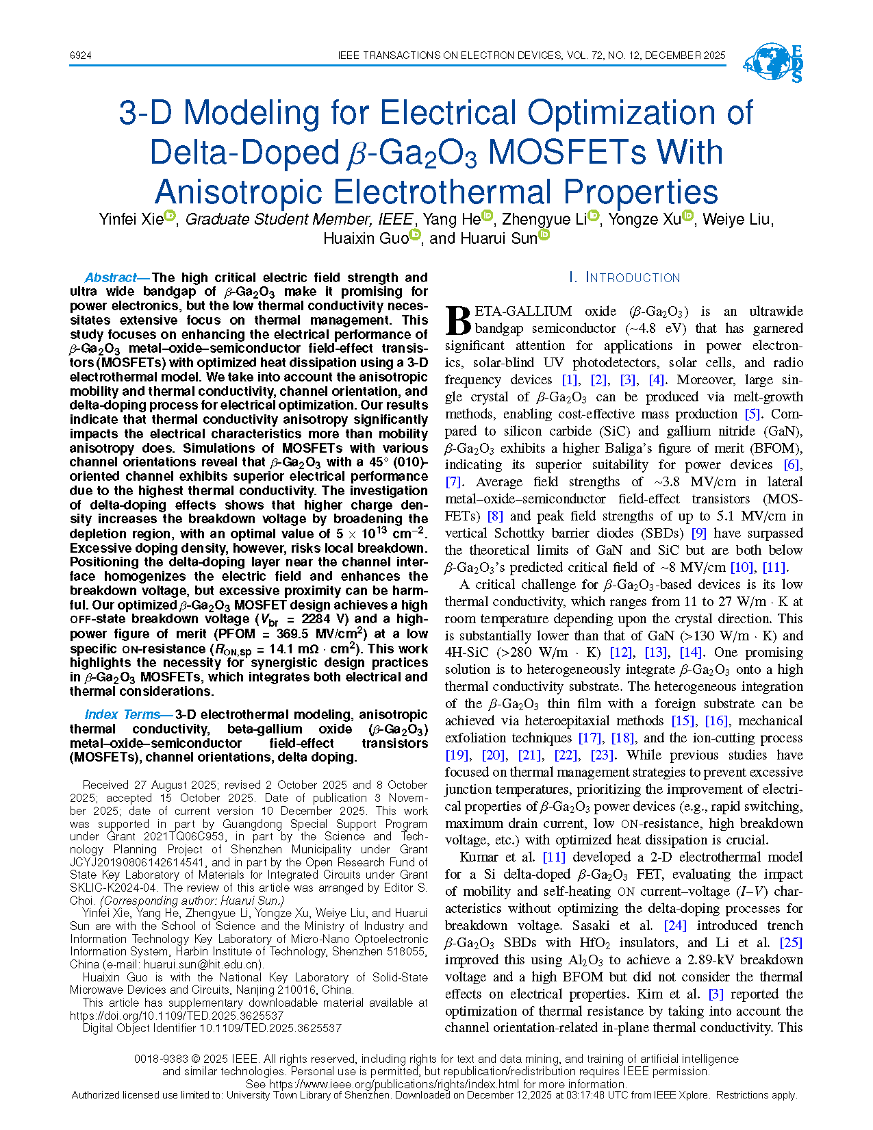 哈尔滨工业大学(深圳)孙华锐教授团队在电子器件领域国际权威期刊《IEEE Transactions on Electron Devices》上发表了题为“3-D Modeling for Electrical Optimization of Delta-Doped β-Ga2O3 MOSFETs With Anisotropic Electrothermal Properties”的研究论文。谢银飞博士为第一作者,孙华锐教授为通讯作者。该研究通过建立三维电热耦合模型,系统探究了 β-Ga2O3 MOSFETs 在电热协同设计下的性能优化路径,为下一代高功率氧化镓器件的设计与制造提供了理论依据与技术支撑。