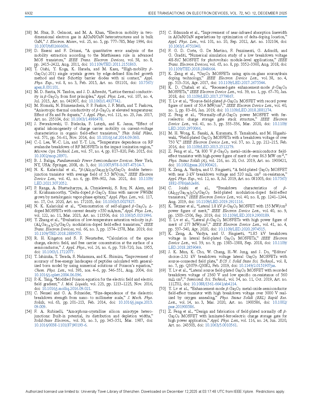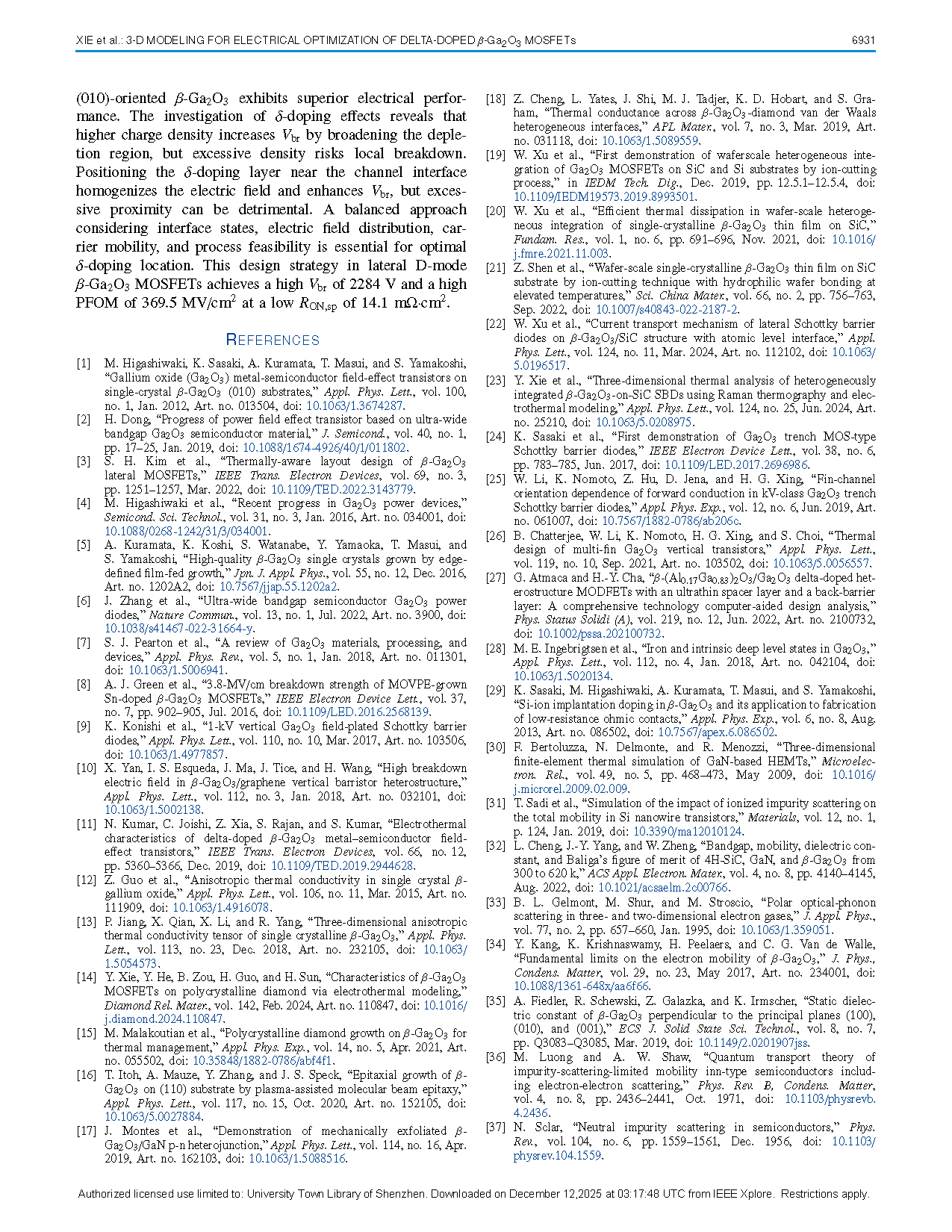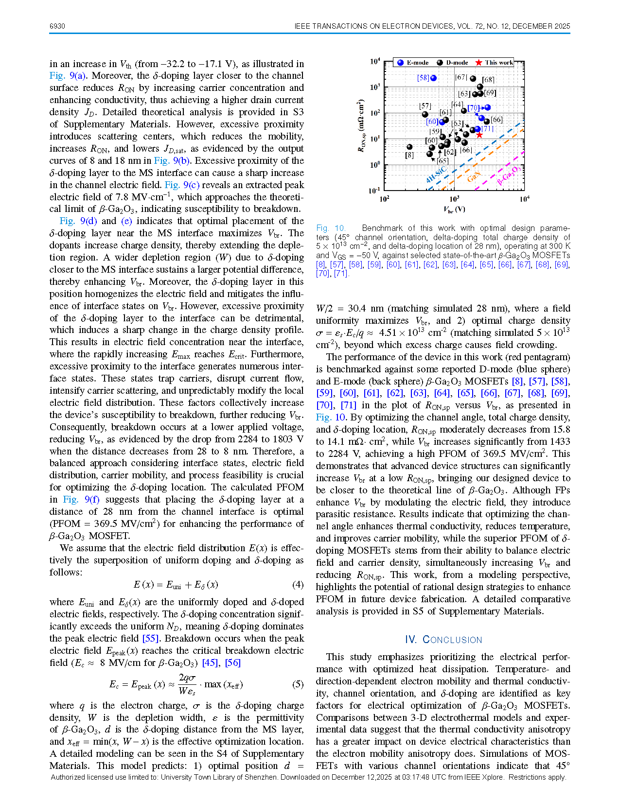 哈尔滨工业大学(深圳)孙华锐教授团队在电子器件领域国际权威期刊《IEEE Transactions on Electron Devices》上发表了题为“3-D Modeling for Electrical Optimization of Delta-Doped β-Ga2O3 MOSFETs With Anisotropic Electrothermal Properties”的研究论文。谢银飞博士为第一作者,孙华锐教授为通讯作者。该研究通过建立三维电热耦合模型,系统探究了 β-Ga2O3 MOSFETs 在电热协同设计下的性能优化路径,为下一代高功率氧化镓器件的设计与制造提供了理论依据与技术支撑。
