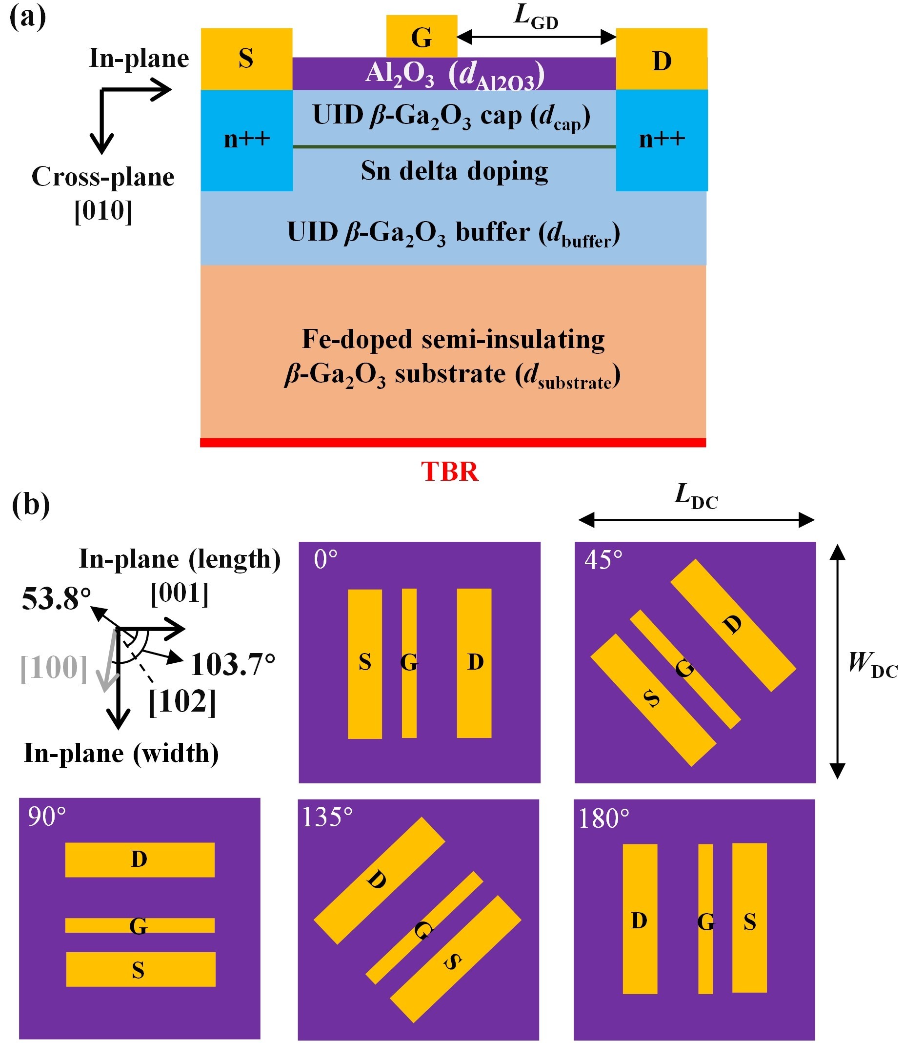 图1. β-Ga2O3 MOSFET剖面示意图。在衬底层底部添加了有效热边界电阻(TBR)。(b) 五种典型沟道取向(0°、45°、90°、135°、180°)的俯视示意图。
