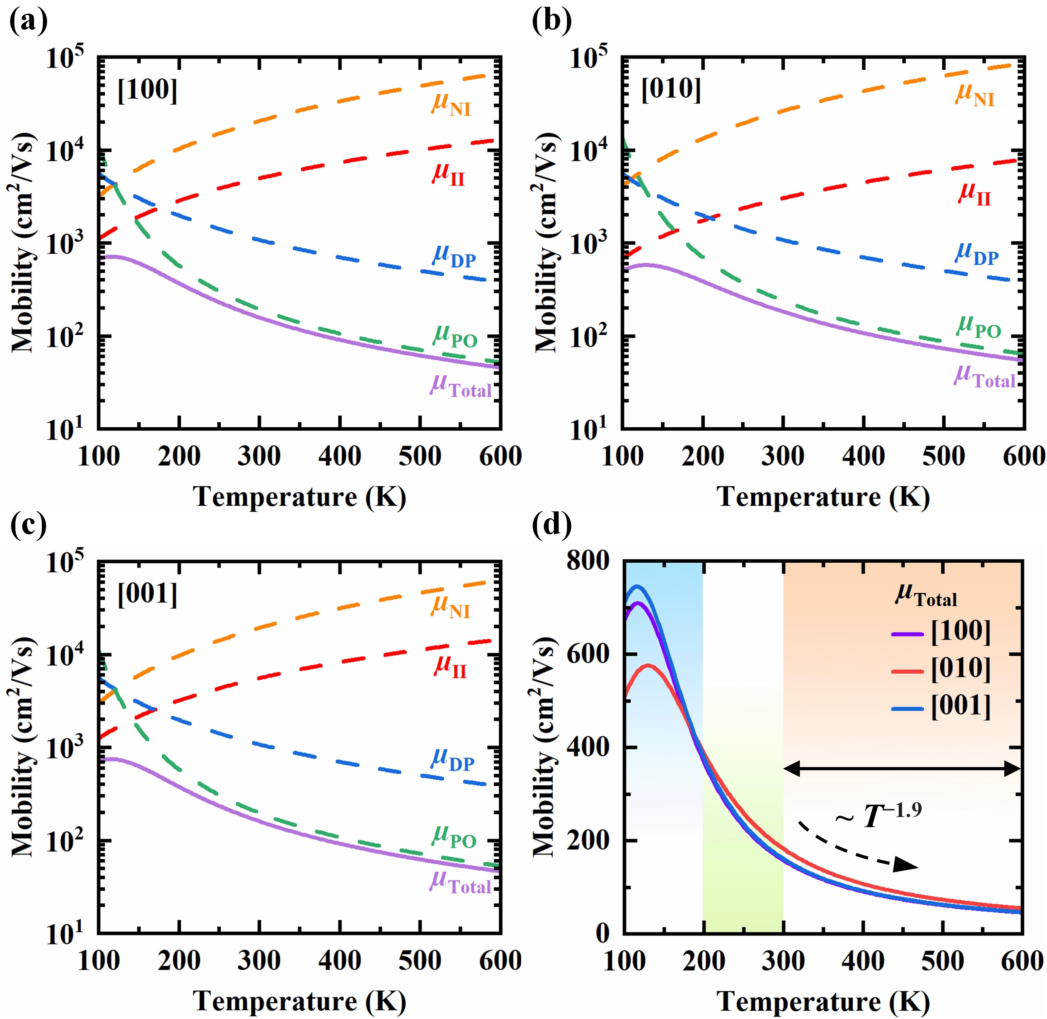 图2. β-Ga2O3 晶体取向为 (a) [100]、(b) [010]、(c) [001] 时的温度依赖电子迁移率计算结果,(d) 三种总迁移率(μTotal)的对比。