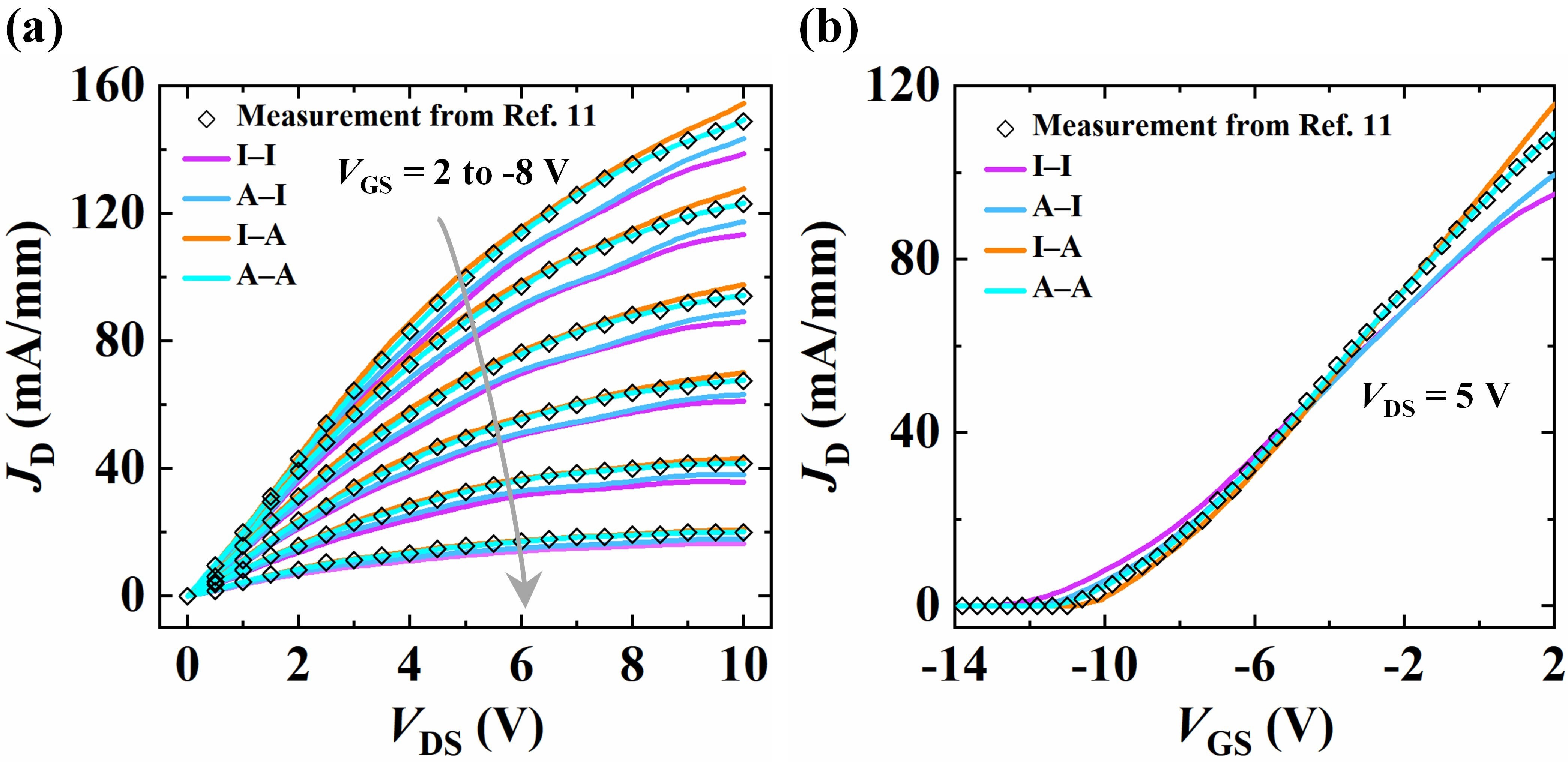 图5. 实验测量结果与本研究电热仿真结果对比:(a) 输出特性曲线,(b) 转移特性曲线(对比配置:各向同性-各向同性(I-I)、各向异性-各向同性(A-I)、各向同性-各向异性(I-A)、各向异性-各向异性(A-A))。