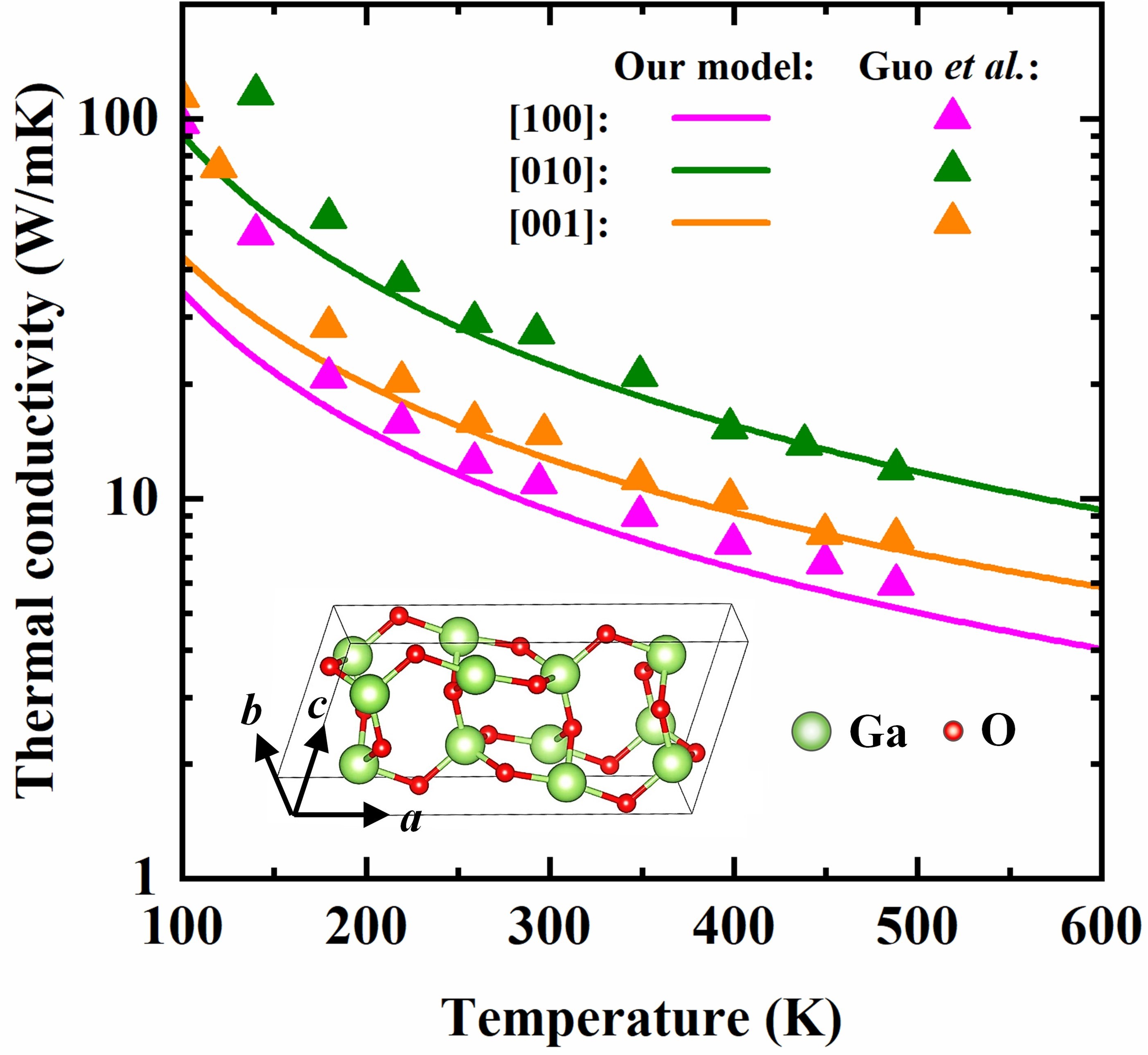 图4. β-Ga2O3 沿[100]、[010]、[001]晶体方向的温度依赖热导率计算结果。