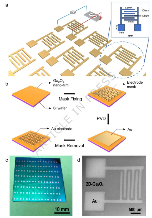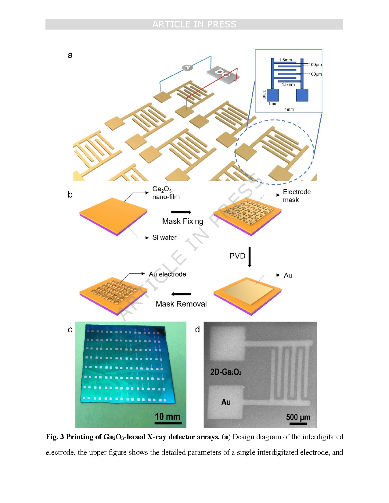 图3. 基于 Ga2O3 的 X 射线探测器阵列的印刷工艺。(a)梳状电极设计图,上图展示单个梳状电极的详细参数,下图呈现梳状电极阵列布局,阵列尺寸为 8×8。(b) 电极蒸镀流程图:首先将掩模固定于预制 Ga2O3 薄膜上,待完全固化后进行物理气相沉积(PVD)蒸镀,蒸镀完成后移除掩模即可获得电极阵列。(c) 电极阵列照片,可见蒸发电极布局均匀清晰。(d) 扫描电子显微镜下的单个电极,在此尺度下电极仍保持清晰轮廓与均匀表面,插齿未出现变形模糊等缺陷。
