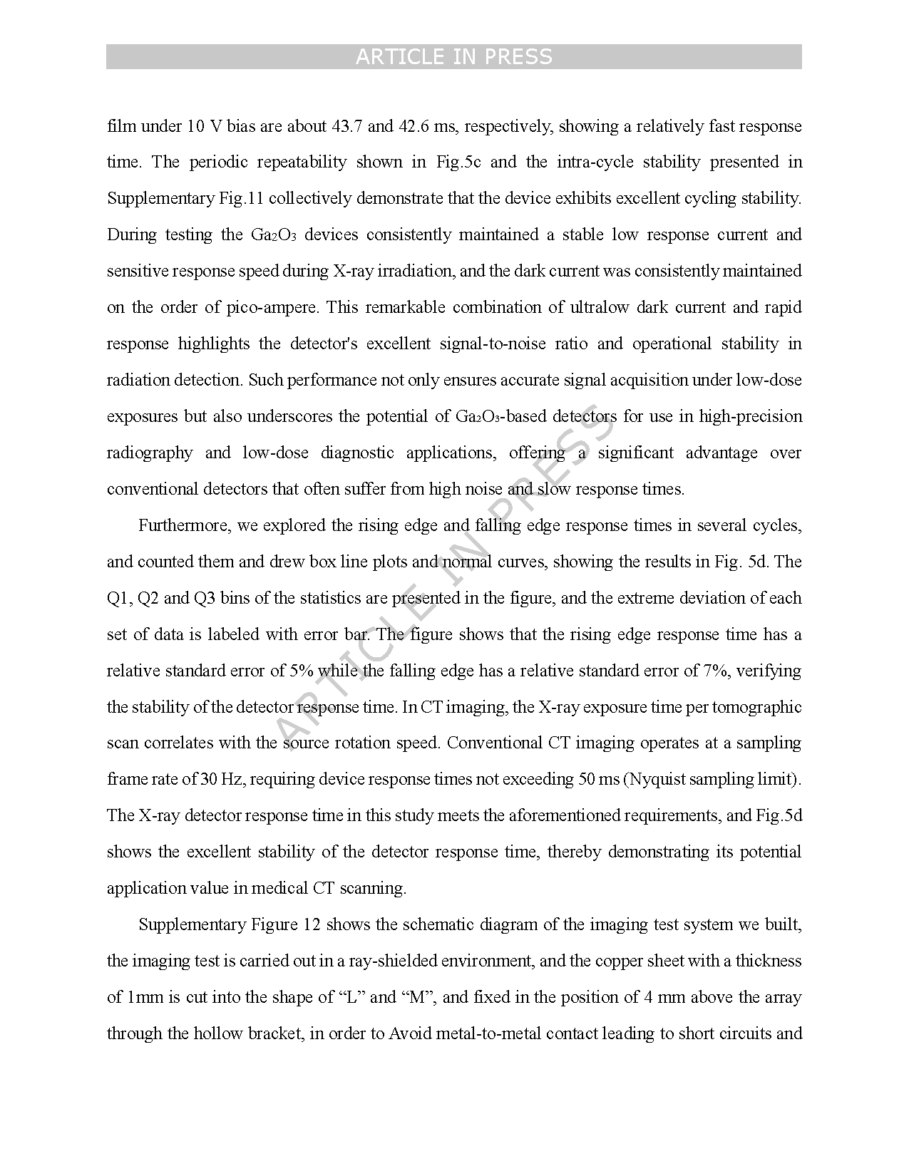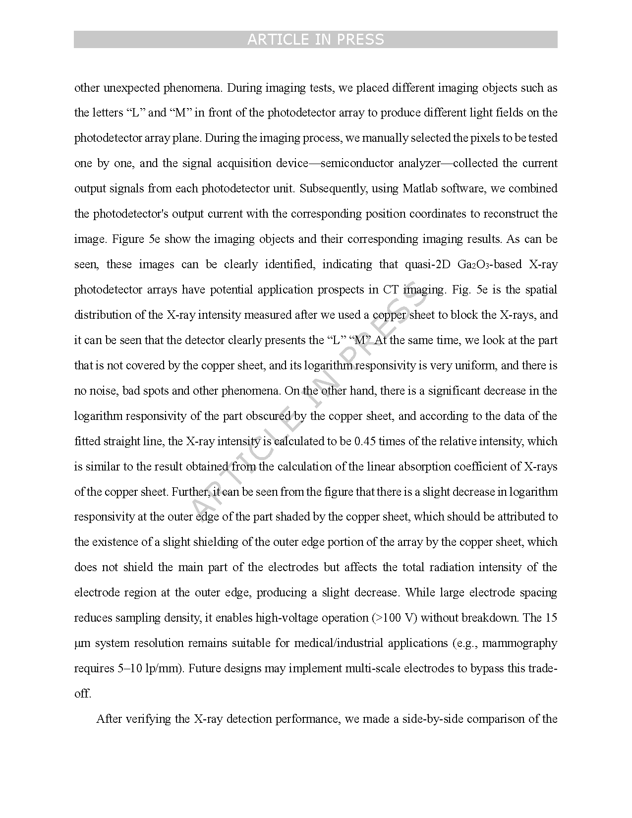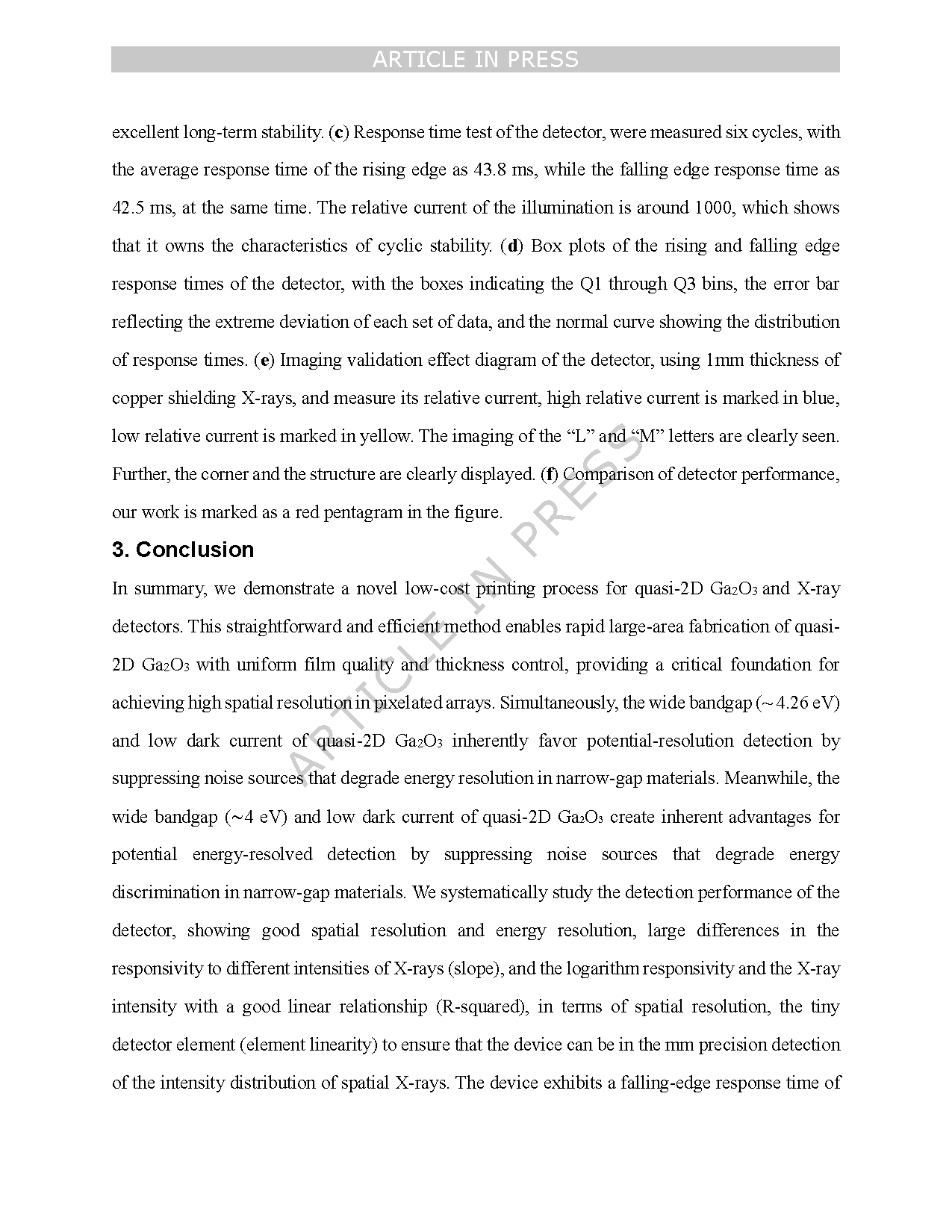 展示了一种用于准二维 Ga2O3 和 X 射线探测器的新型低成本印刷工艺。该方法操作简便且高效,能够快速实现大面积准二维 Ga2O3 薄膜的制备,同时确保薄膜质量均匀且厚度可控,为实现像素化阵列的高空间分辨率奠定了关键基础。同时,准二维 Ga2O3 材料具有宽带隙(~4.26 eV)和低暗电流特性,能有效抑制窄带隙材料中影响能量分辨率的噪声源,从而天然适用于电位分辨检测。此外,准二维 Ga2O3 的宽带隙(约 4 eV)与低暗电流特性,通过抑制窄带隙材料中影响能量鉴别度的噪声源,为电位能分辨检测创造了固有优势。系统研究了该探测器的性能表现:其空间分辨率与能量分辨率均表现优异,对不同强度 X 射线的响应度差异显著(斜率), 以及对数响应度与 X 射线强度的良好线性关系(R 平方值)。在空间分辨率方面,微型探测器单元(单元线性度)确保设备能实现毫米级精度的空间 X 射线强度分布检测。该器件展现出小于 45 ms 的下降沿响应时间,证明其对 X 射线具有优异的瞬态响应能力,为新型 CT 成像技术奠定坚实基础。首次采用液态金属纳米压印技术,基于非晶态准二维 Ga2O3 构建了 8×8 X 射线探测成像阵列系统。这项工作为大面积、高质量、可控制地制备新一代高性能 X 射线探测器和成像系统提供了简单、高效且低成本的新策略,对开发灵敏、快速、稳定的 X 射线成像探测器乃至 CT 核心检测元件具有重大意义和价值。虽然本研究侧重于基础灵敏度和低电压运行指标,但定量空间或能量分辨率测量需要像素化阵列集成和光谱表征,这是实际应用的重要后续步骤。
