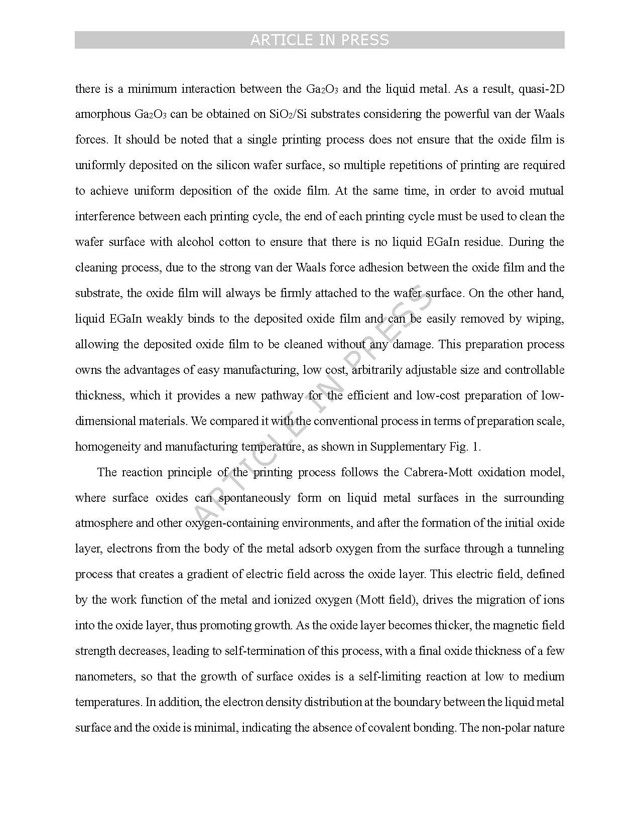 •利用液态金属氧化膜纳米印刷,实现了一种快速、低成本、可扩展的制备方案,能够直接印刷出极薄且高质量的氧化镓膜。